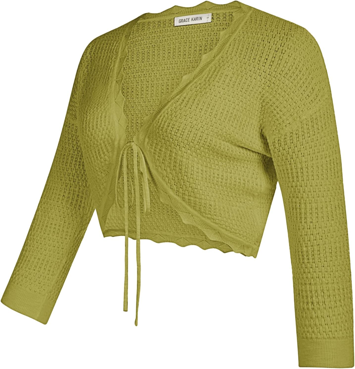 GRACE KARIN Womens 34 Sleeve Cropped Cardigan Sweater Elegant Crochet Knit Bolero Shrugs for Women DressesYellow Green