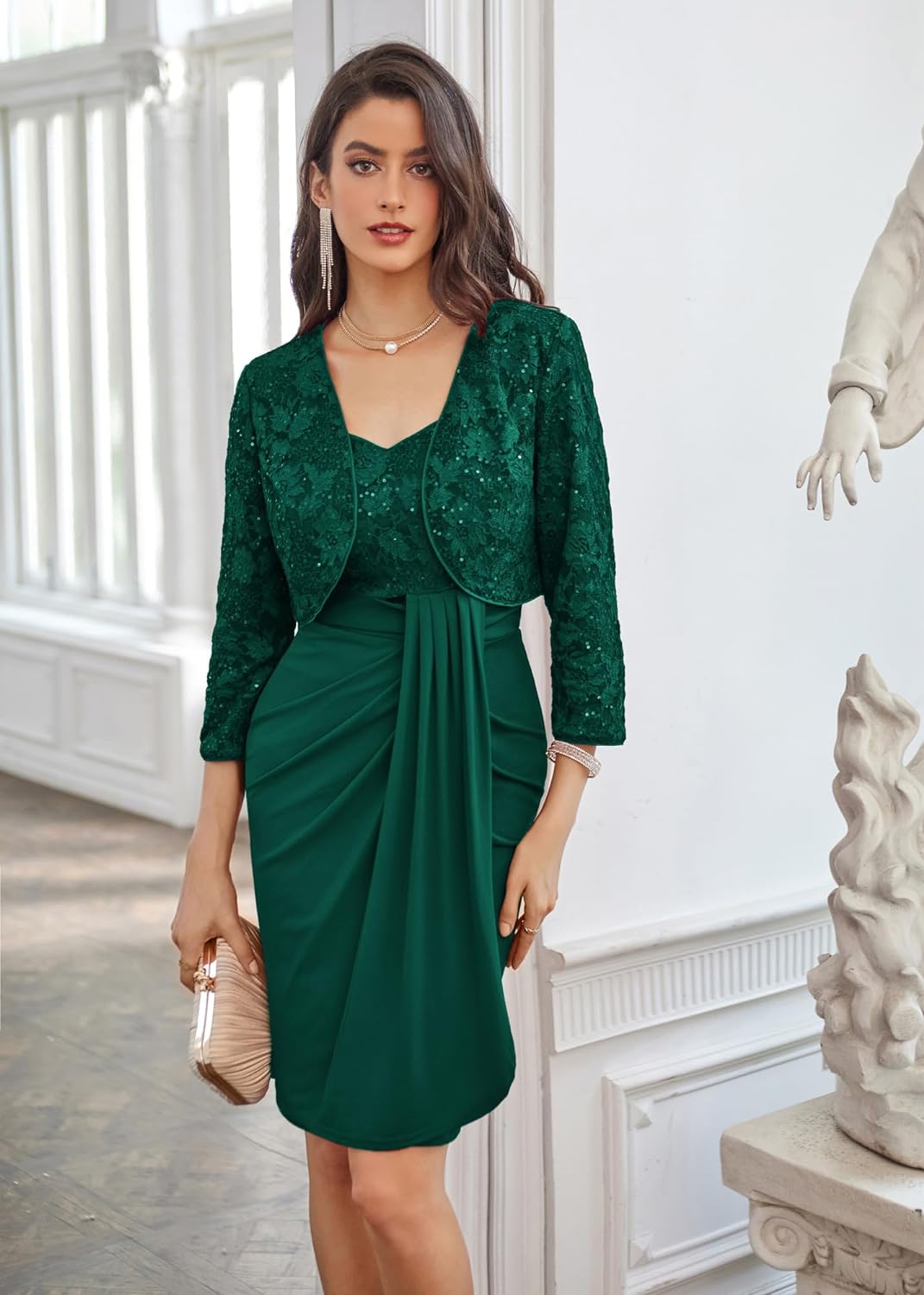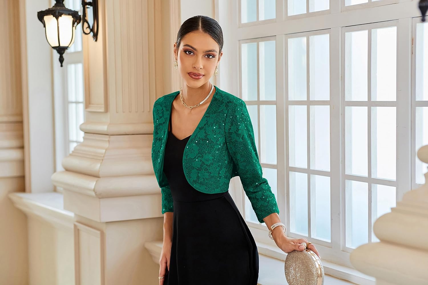 GRACE KARIN Women's 3/4 Sleeve Open Front Sequin Floral Lace Cropped Shrug Bolero Cardigan(Dark Green)