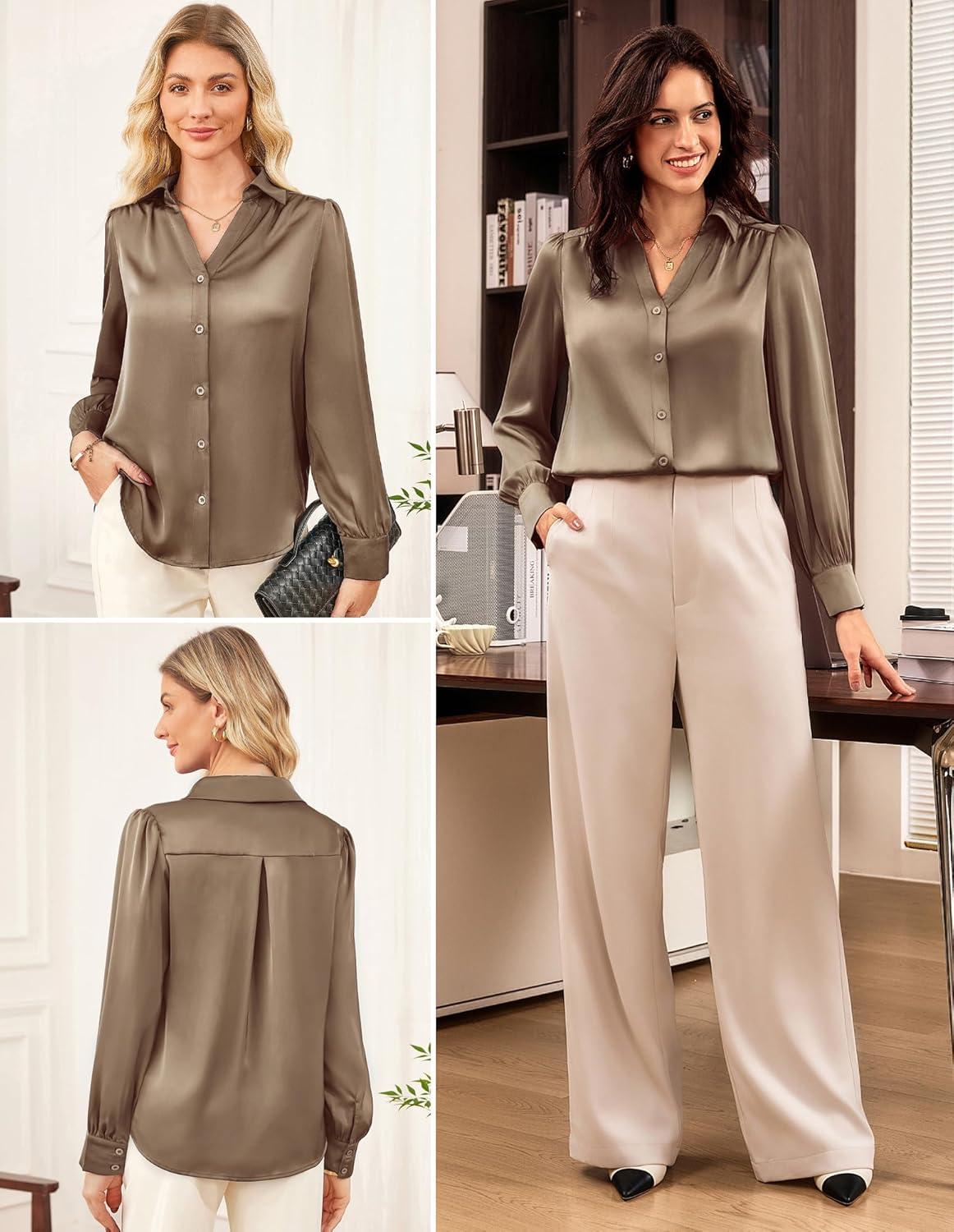 GRACE KARIN Womens Business Casual Tops Long Sleeve Satin Silk Blouse Button Down Work Shirts Dressy Tops Fall Fashion 2025(Taupe)