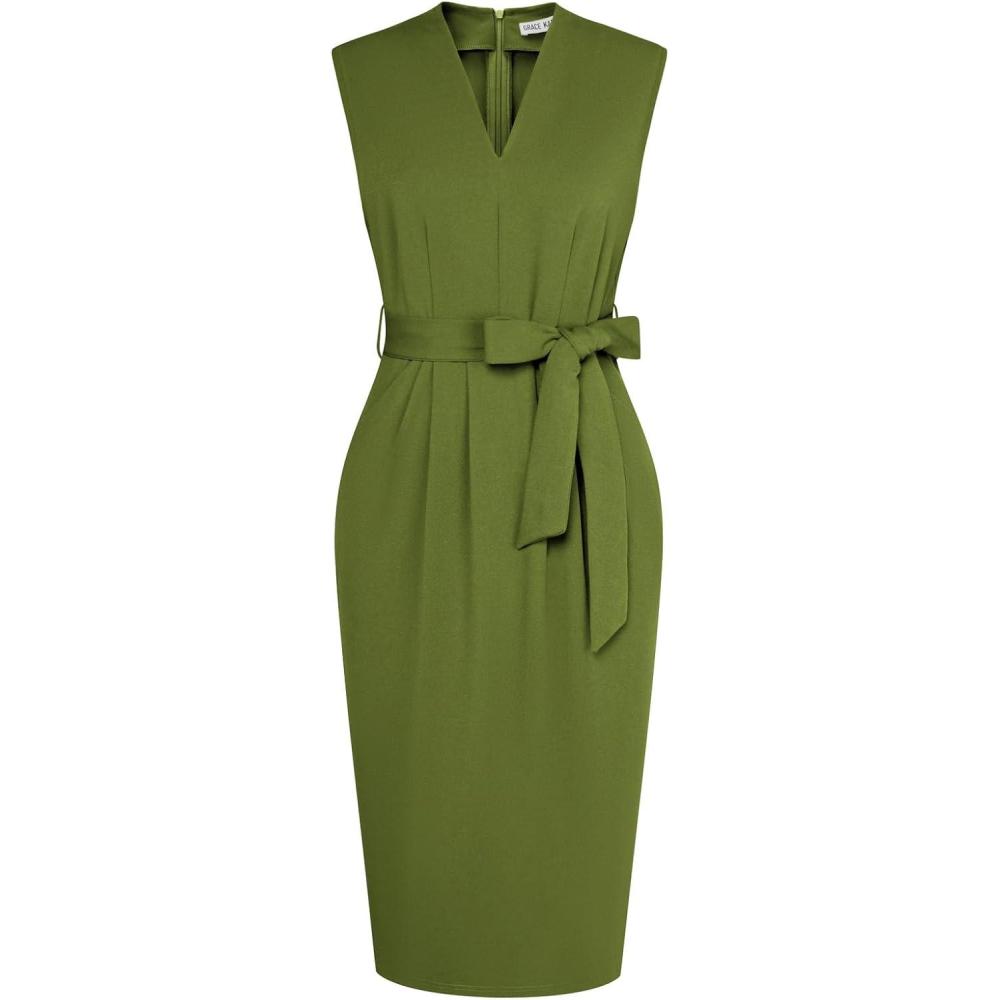 GRACE KARIN Women’s Business Dresses Sleeveless V Neck Bodycon Sheath Dress Zipper Up Office Work Dress with Pockets(Army Green)