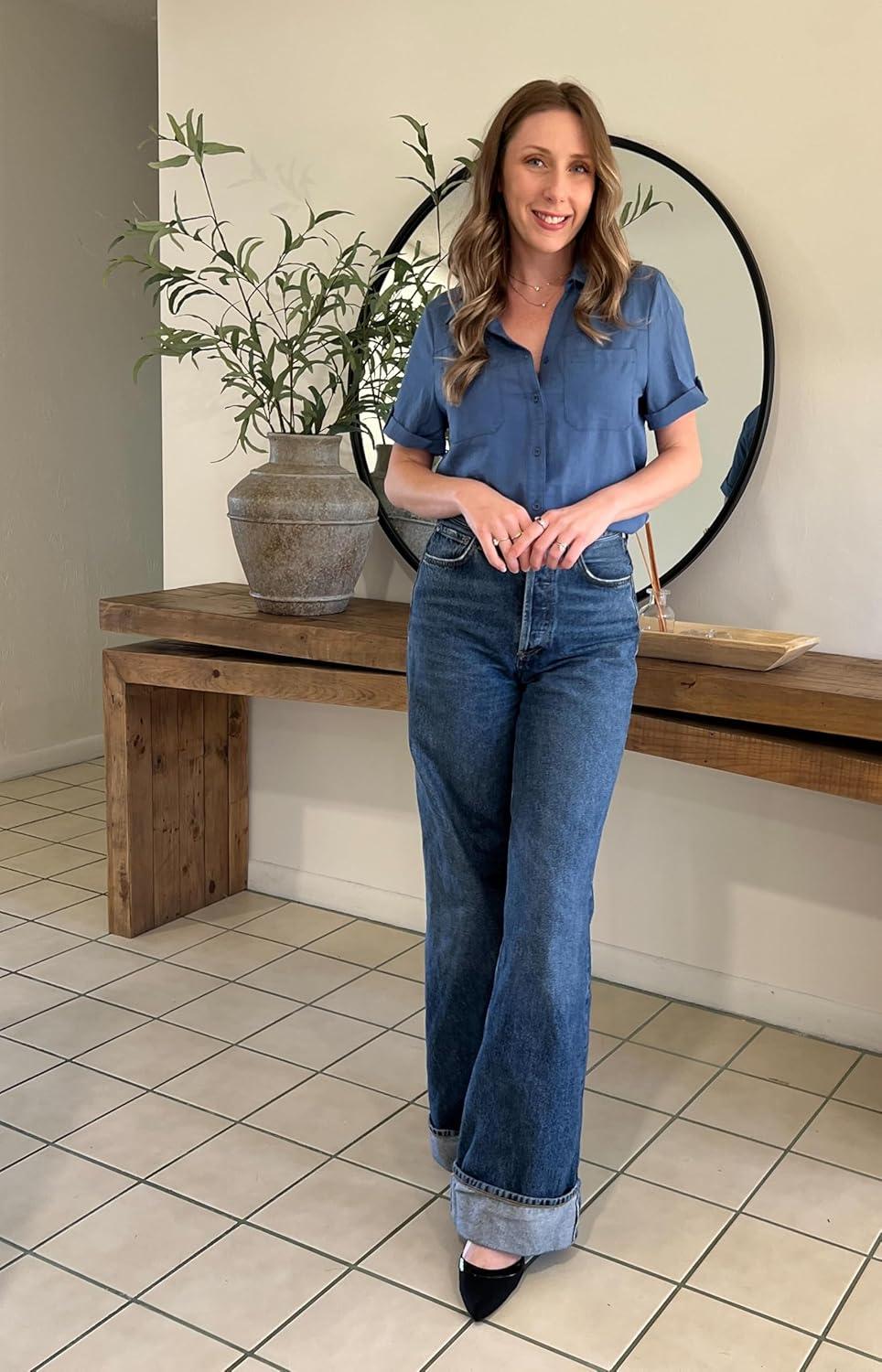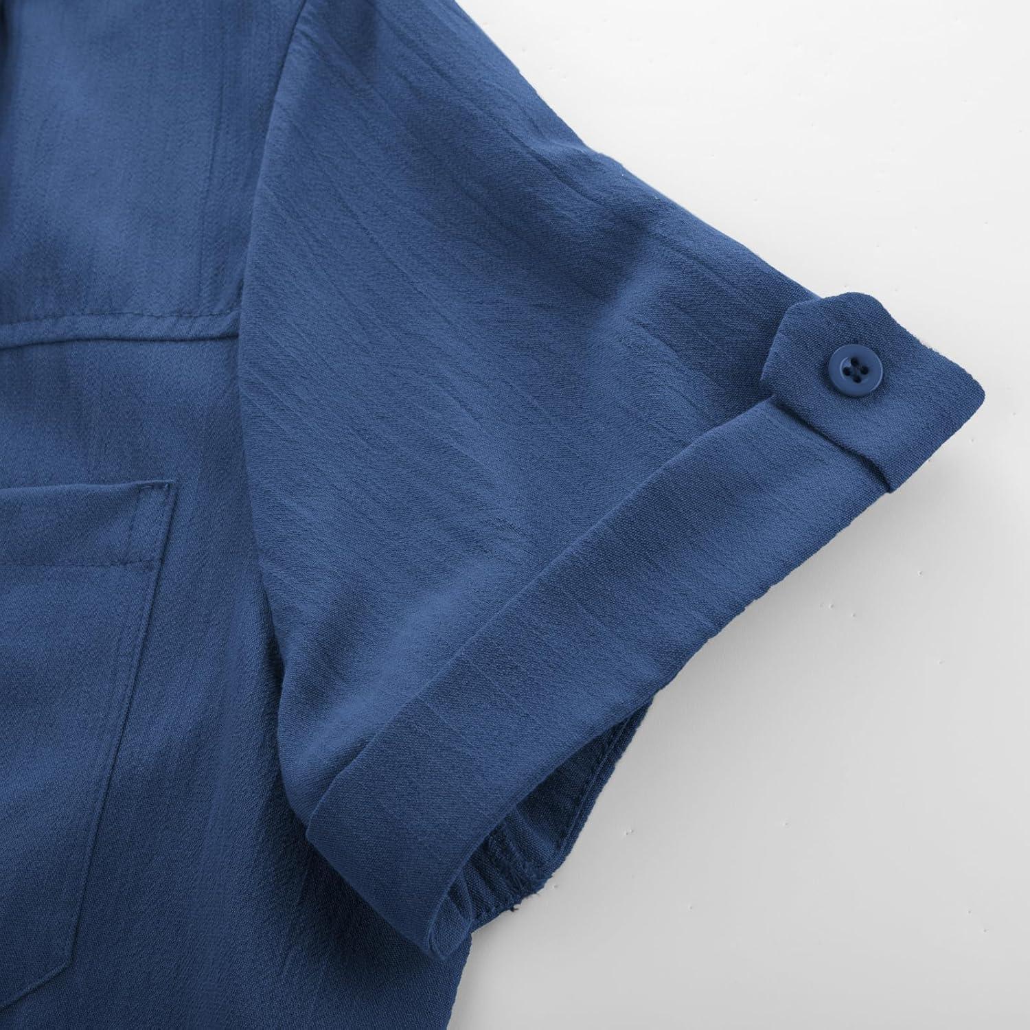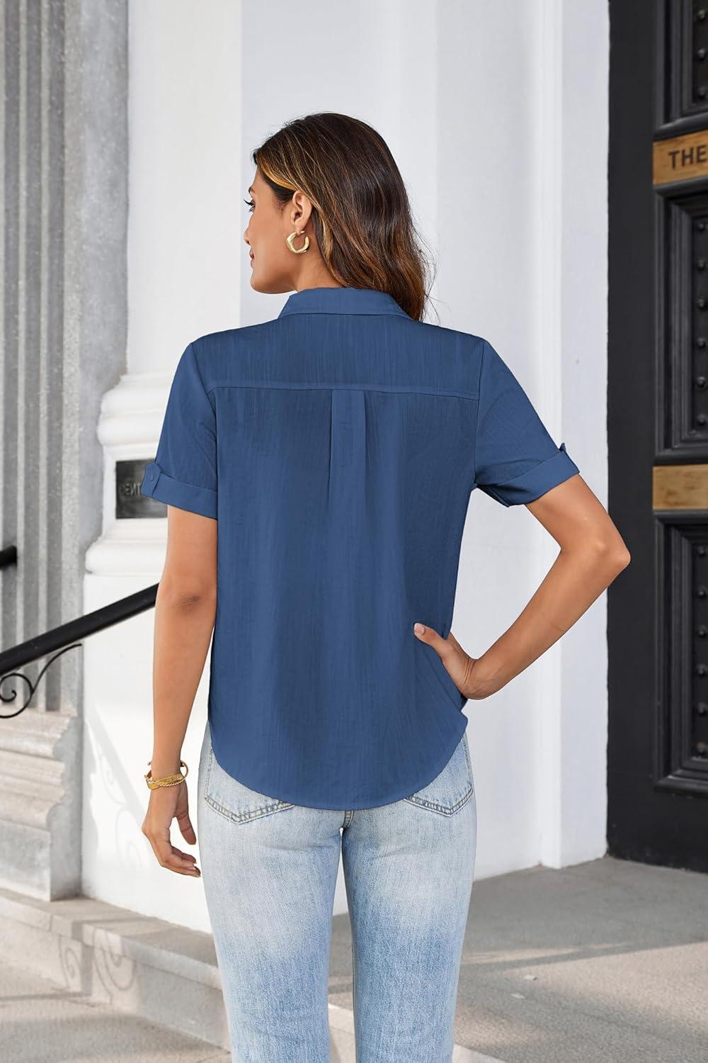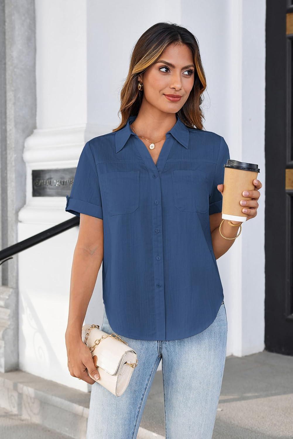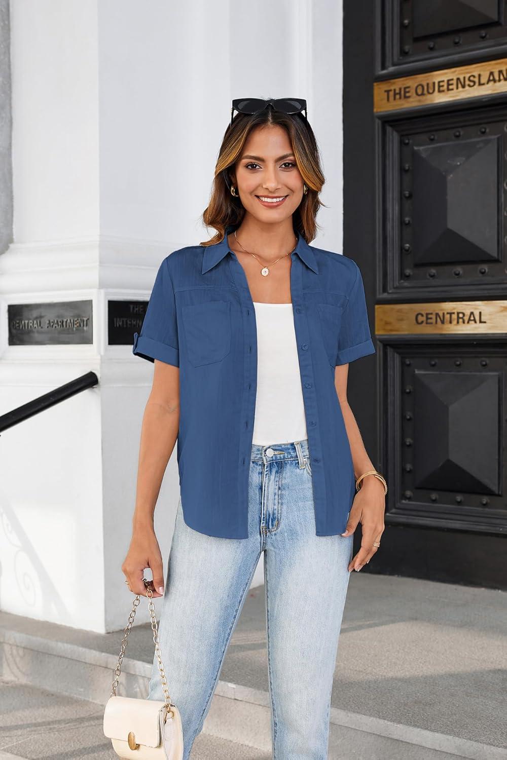 GRACE KARIN Womens Button Down Blouse Casual Short Sleeve Summer V Neck Top Teacher Shirts for Women Blue L
