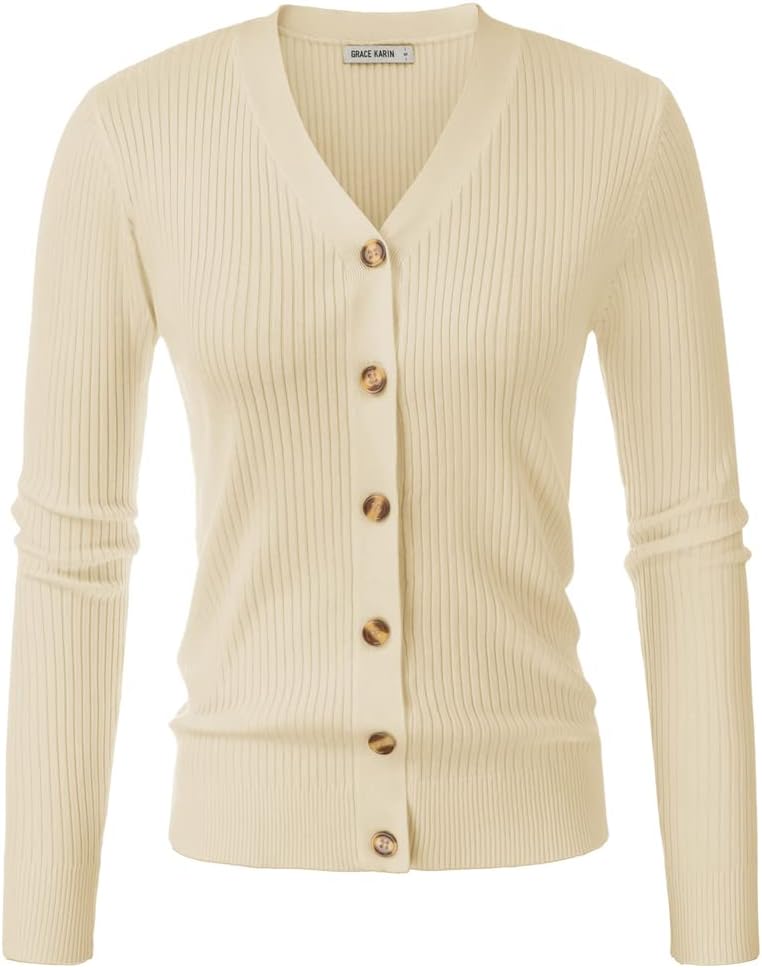 GRACE KARIN Women’s Button Down Vee Neck Long Sleeve Rib Knit Cardigan Sweaters(Nude)