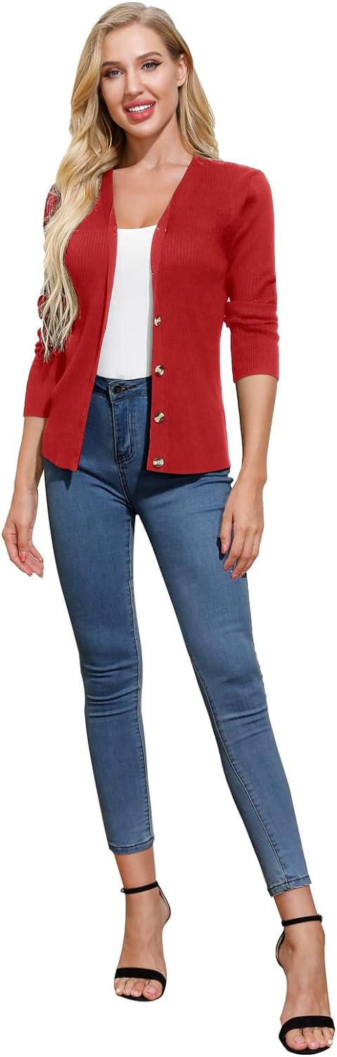GRACE KARIN Women’s Button Down Vee Neck Long Sleeve Rib Knit Cardigan Sweaters(Red)