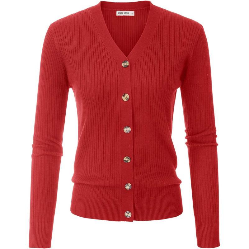 GRACE KARIN Womens Button Down Vee Neck Long Sleeve Rib Knit Cardigan SweatersRed