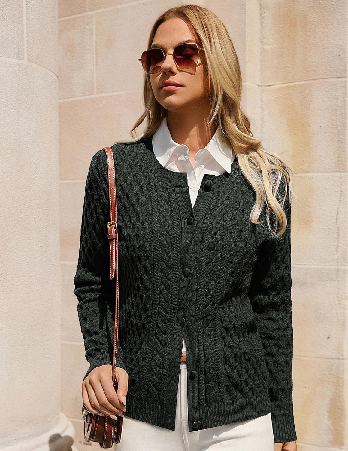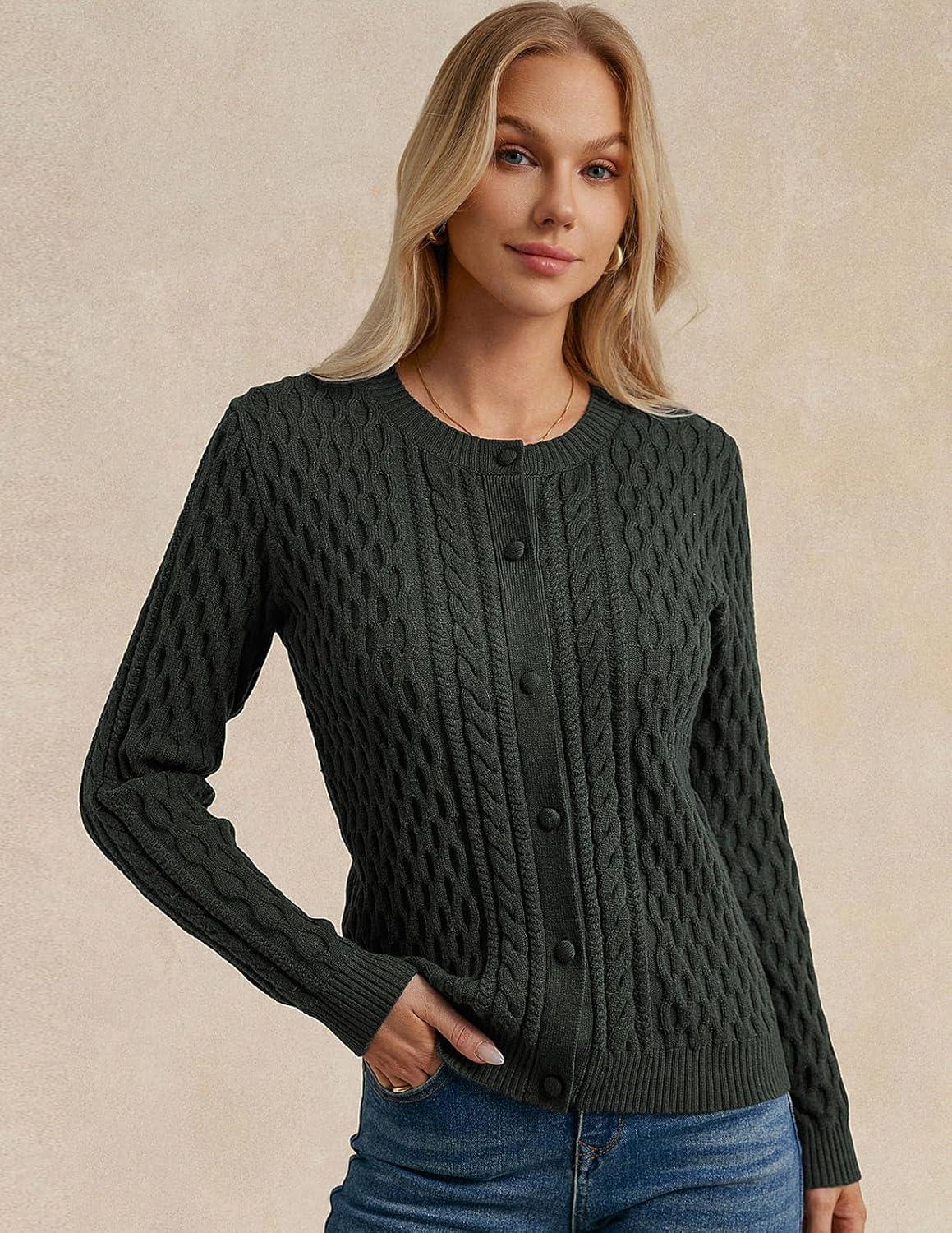 GRACE KARIN Womens Cable Knit Cardigan Button Up Sweater Soft Open Front Cardigans Crewneck Long Sleeve Outwear(Army Green)