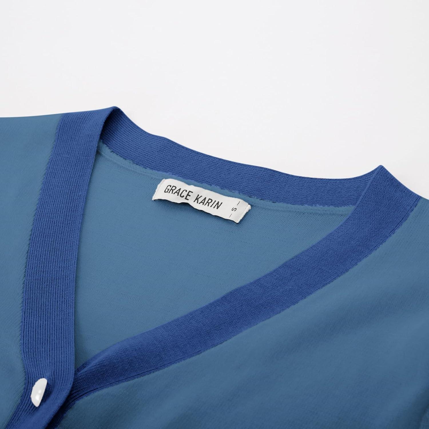 GRACE KARIN Womens Cardigan Contrast Color Block Sweaters Lightweight Long Sleeve Cropped Cardigan V-Neck Striped Shrugs(Gray Blue)