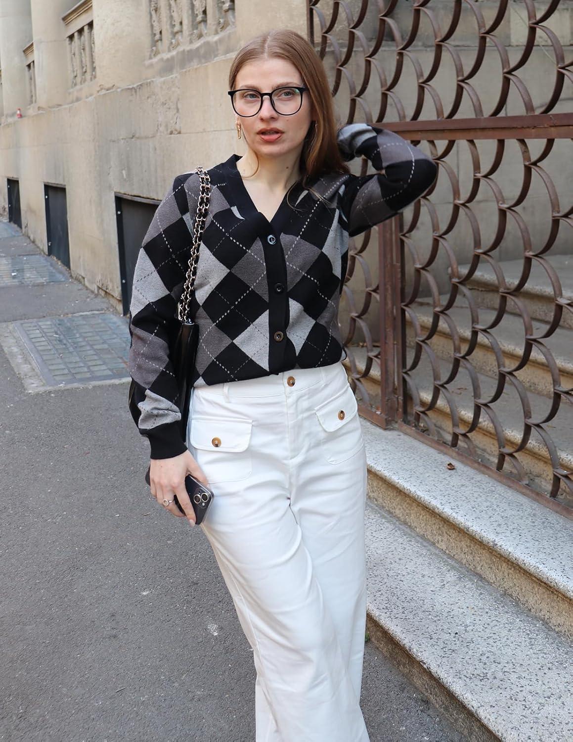 GRACE KARIN Womens Cardigan Sweater Fall Long Sleeve Argyle Sweater V Neck Button Up Cardigan Color Block Preppy Clothes(Plaid Gray Black)