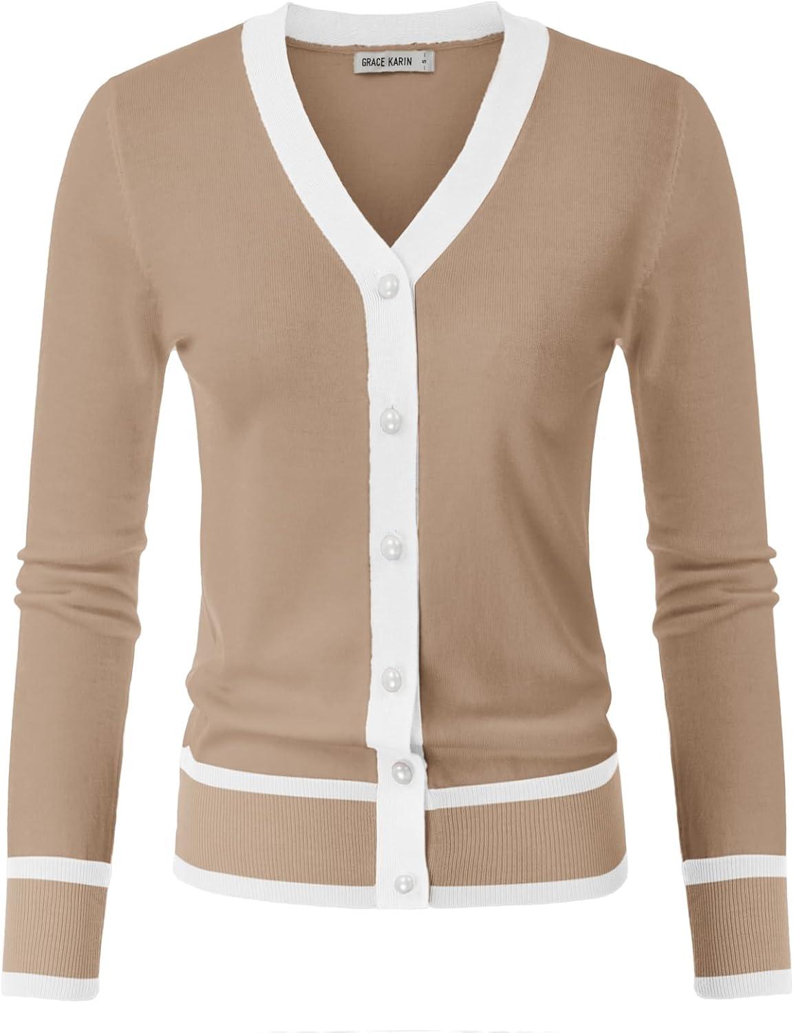 imageGRACE KARIN Womens Cardigan Sweaters Lightweight Long Sleeve Cropped Cardigan VNeck Striped Shrugs Fall ClothesBeige White