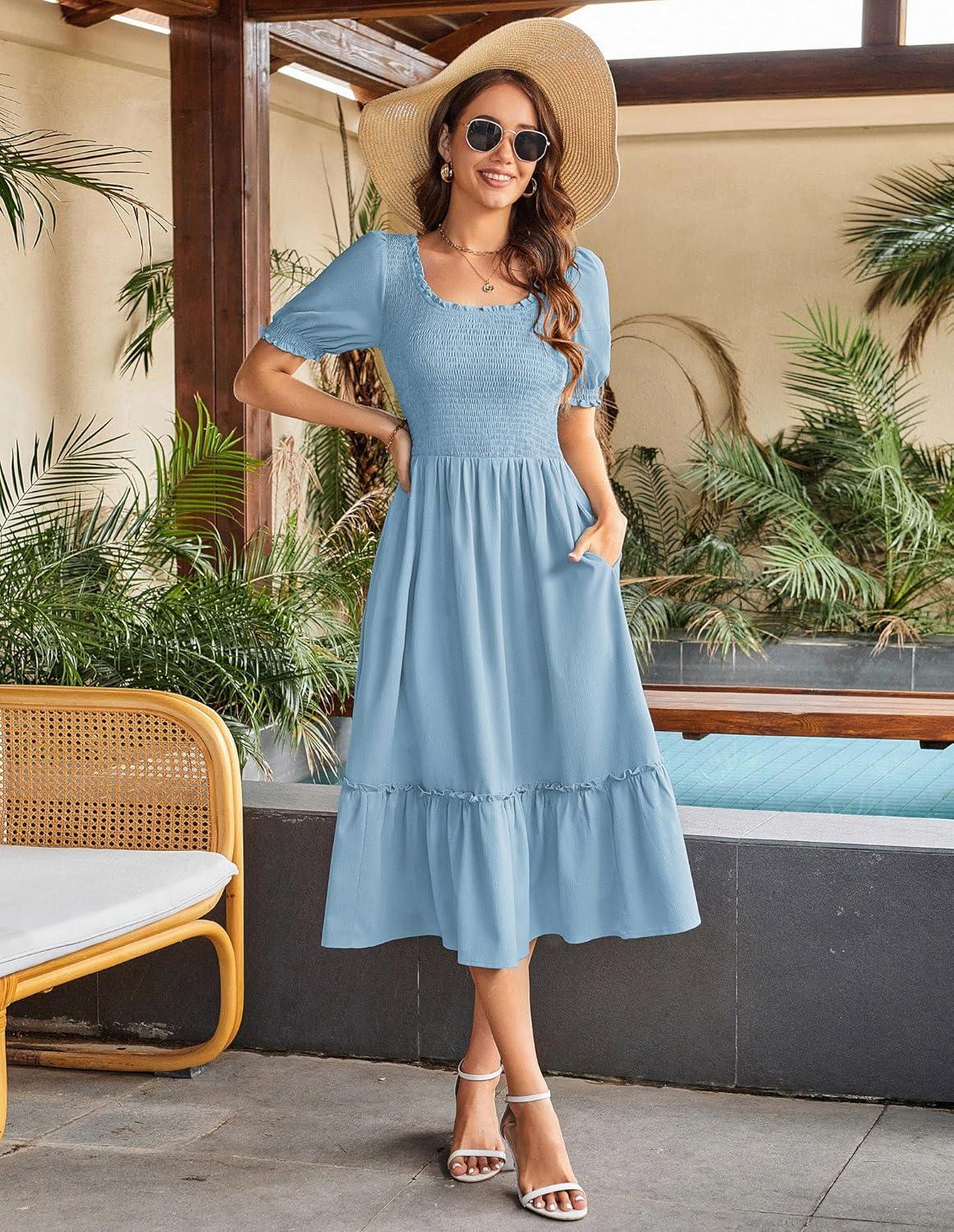 GRACE KARIN Women's Casual Summer Dresses Puff Short Sleve Square Neck Smocked Midi Dress A Line Flowy Dresses with Pockets(Light Blue)