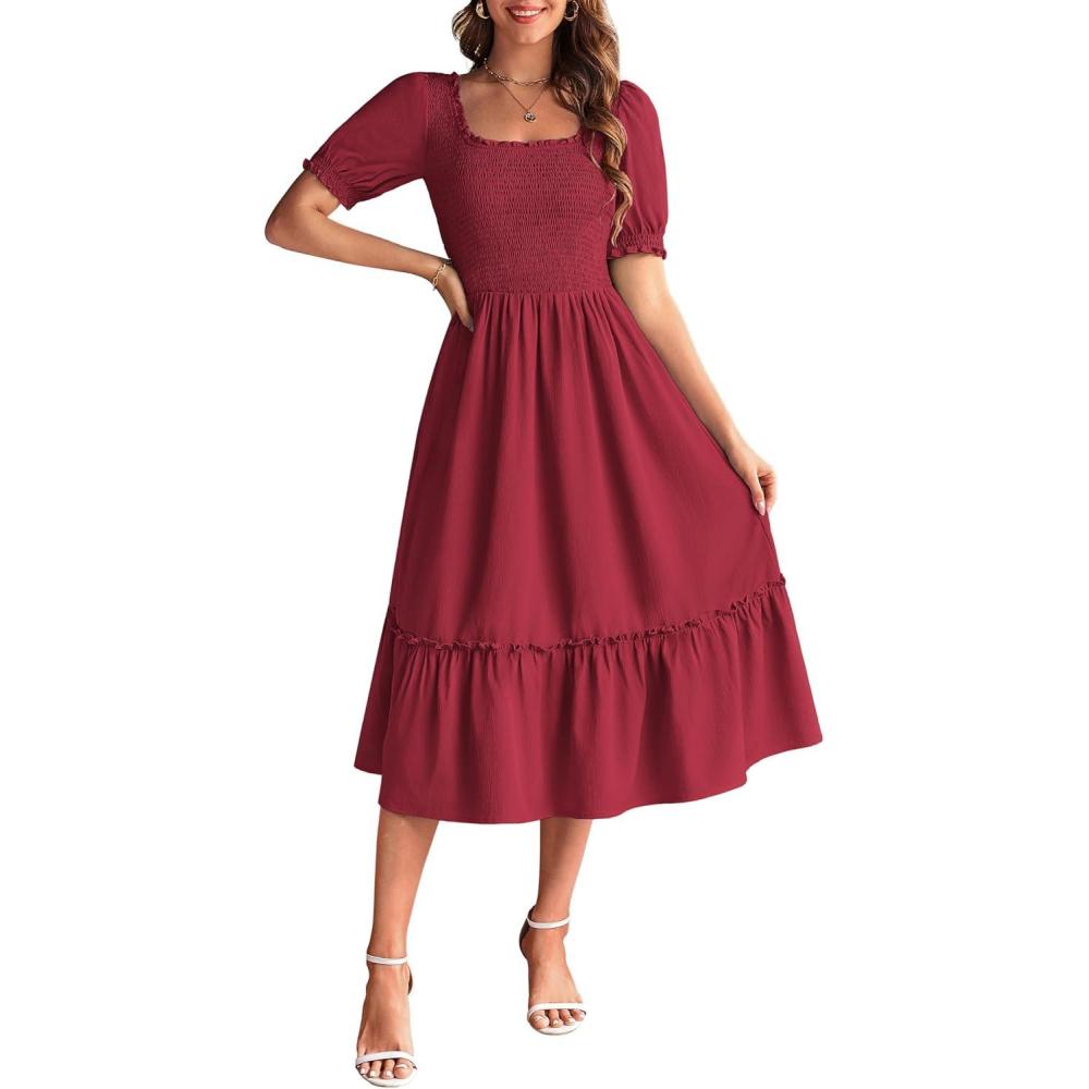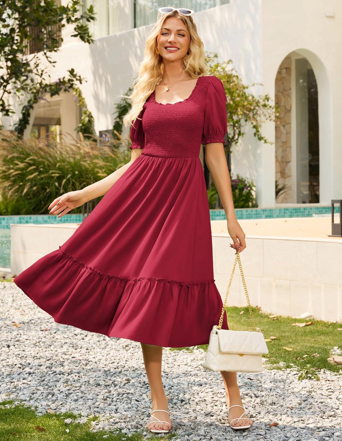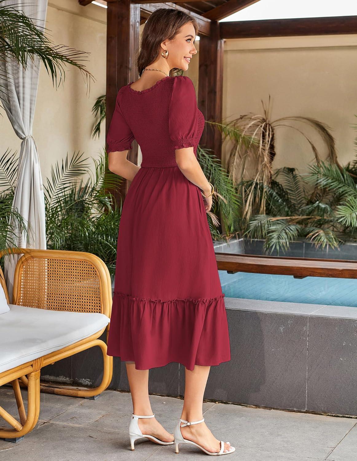 GRACE KARIN Women's Casual Summer Dresses Puff Short Sleve Square Neck Smocked Midi Dress A Line Flowy Dresses with Pockets(Wine Red)