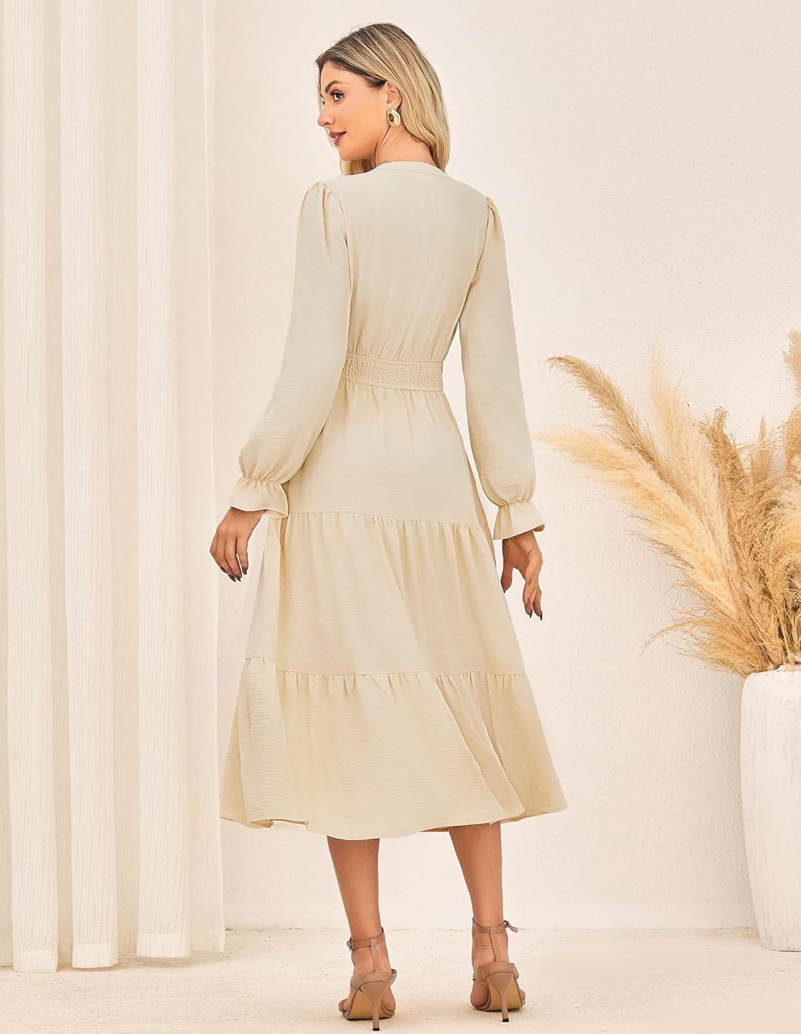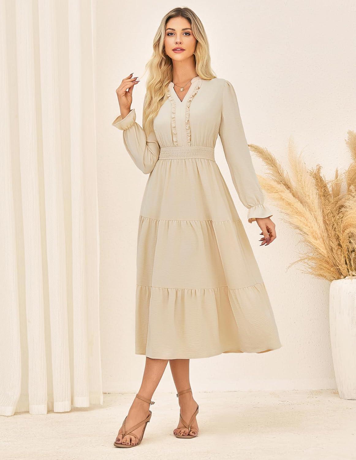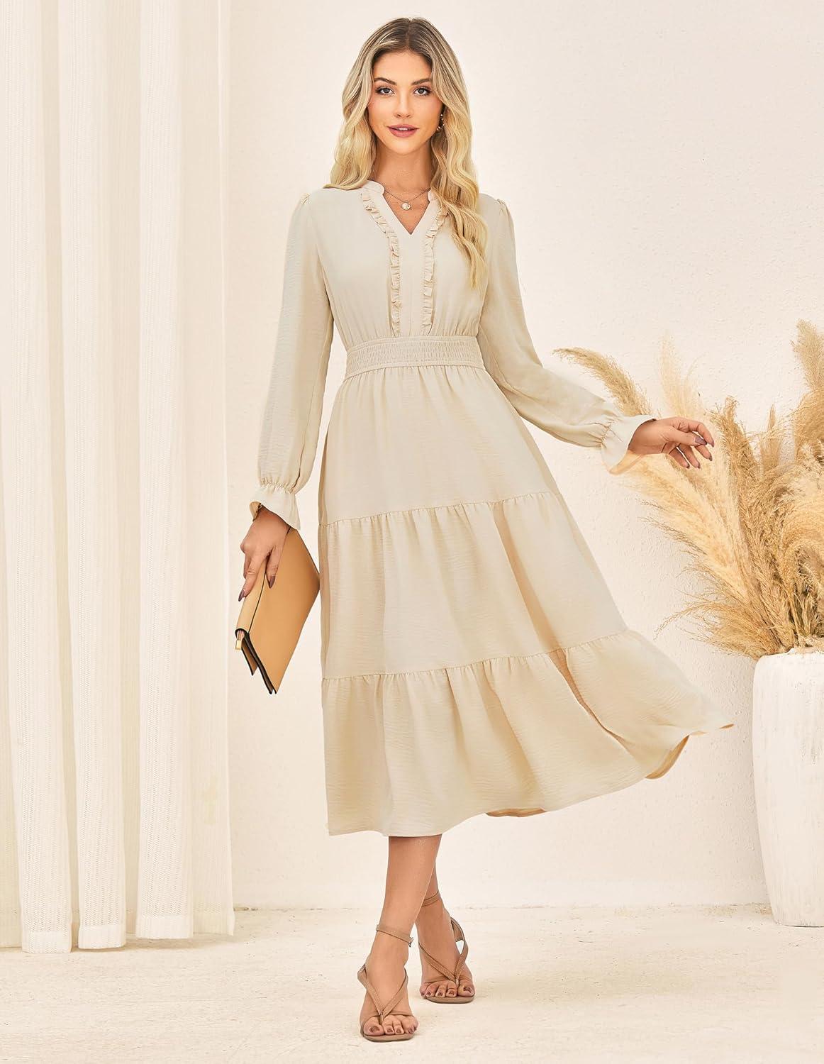 GRACE KARIN Women’s Casual V Neck Lantern Long Sleeve Ruffle Smocked Waist Tiered Midi A Line Dress with Pockets(Apricot)