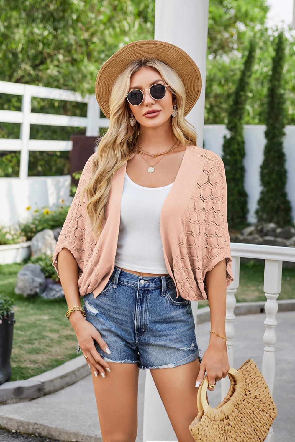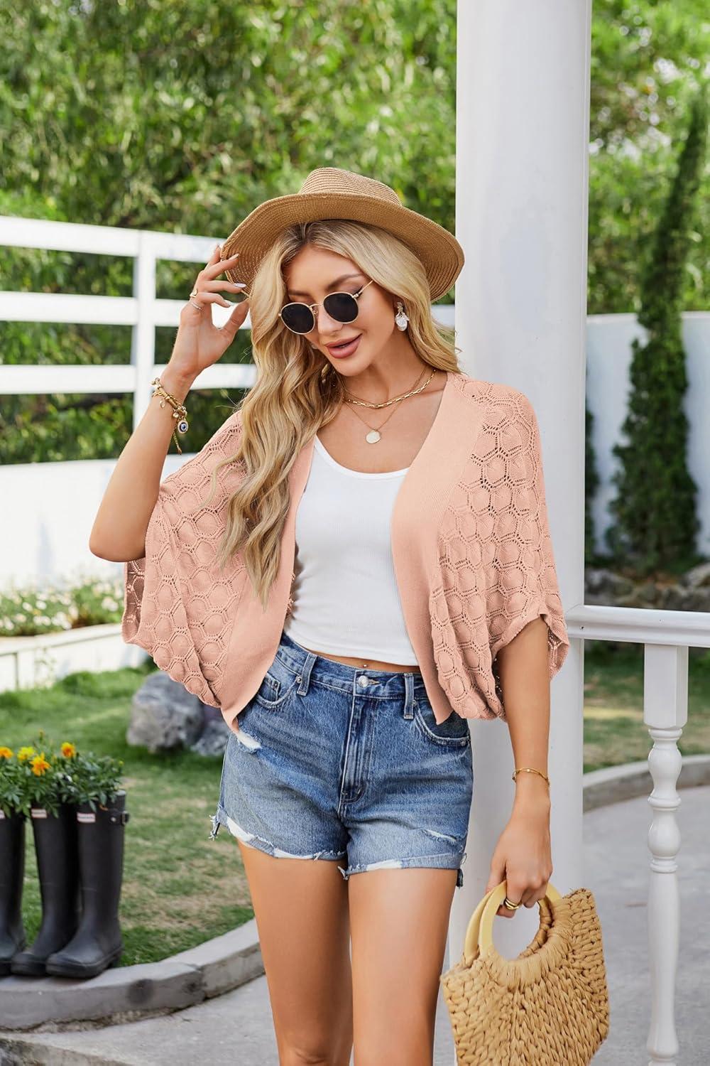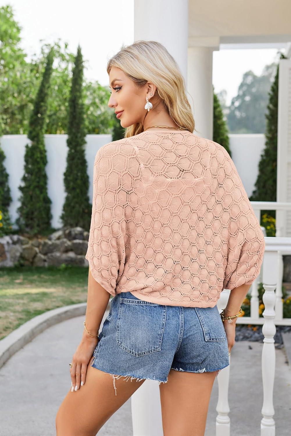 GRACE KARIN Womens Crochet Summer Cardigan Shrug 2024 Lightweight Open Front Hollow-Out Batwing Cardigan Sweater Outwear(Pink)