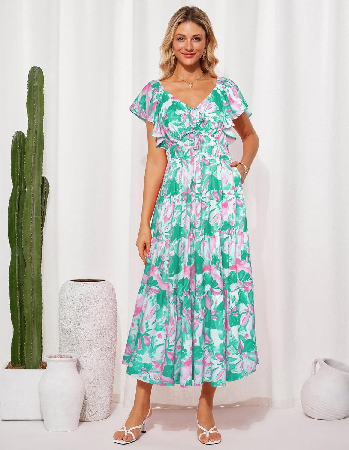 GRACE KARIN Womens Elegant Floral Summer V-Neck Ruffle Sleeve Empire Waist A-Line Casual Maxi Tiered Dress with Pockets(Green)