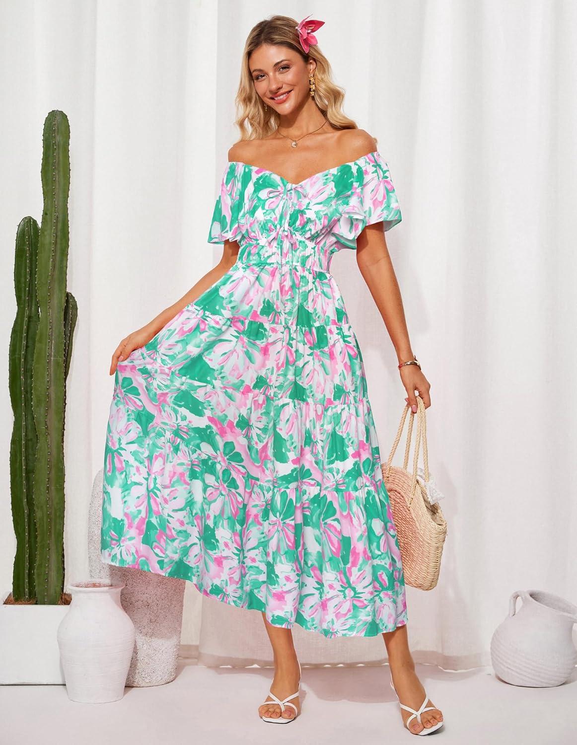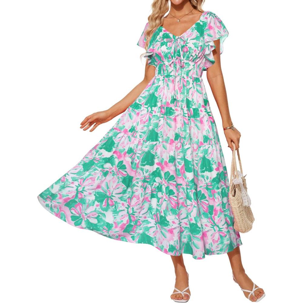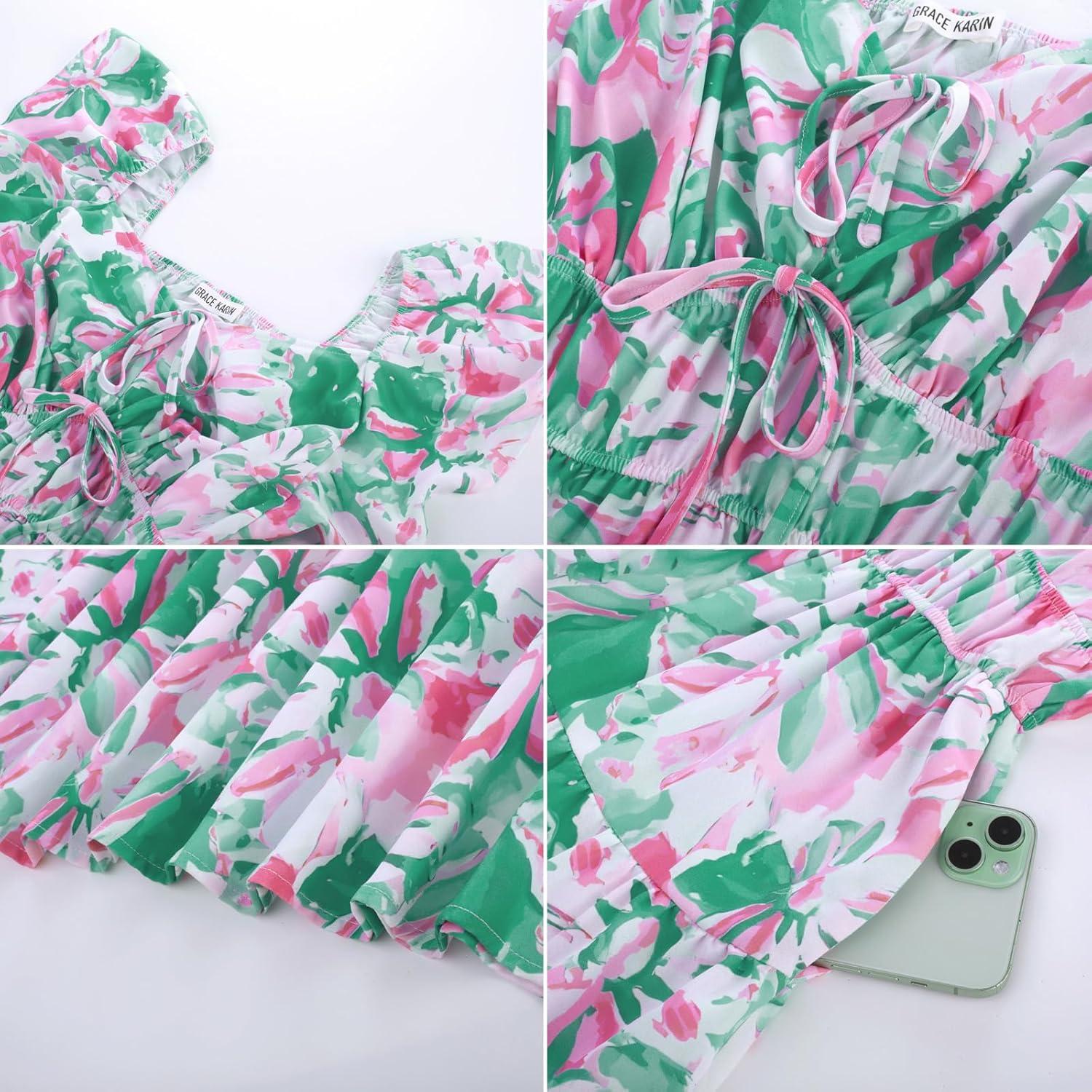 Get the GRACE KARIN Womens Elegant Floral Summer V-Neck Ruffle Sleeve Empire Waist A-Line Casual Maxi Tiered Dress with Pockets(Green) you want at a price you can afford with our markdown sale.