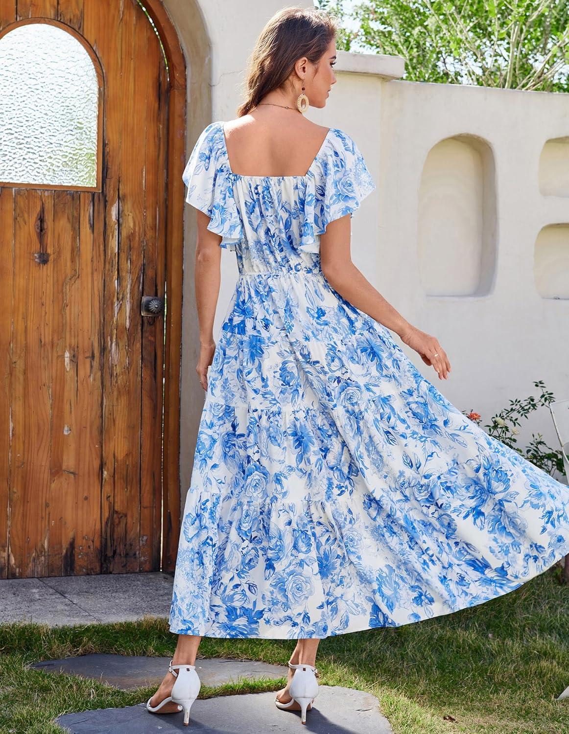 GRACE KARIN Womens Elegant Floral Summer V-Neck Ruffle Sleeve Empire Waist A-Line Casual Maxi Tiered Dress with Pockets(White Blue Flower)