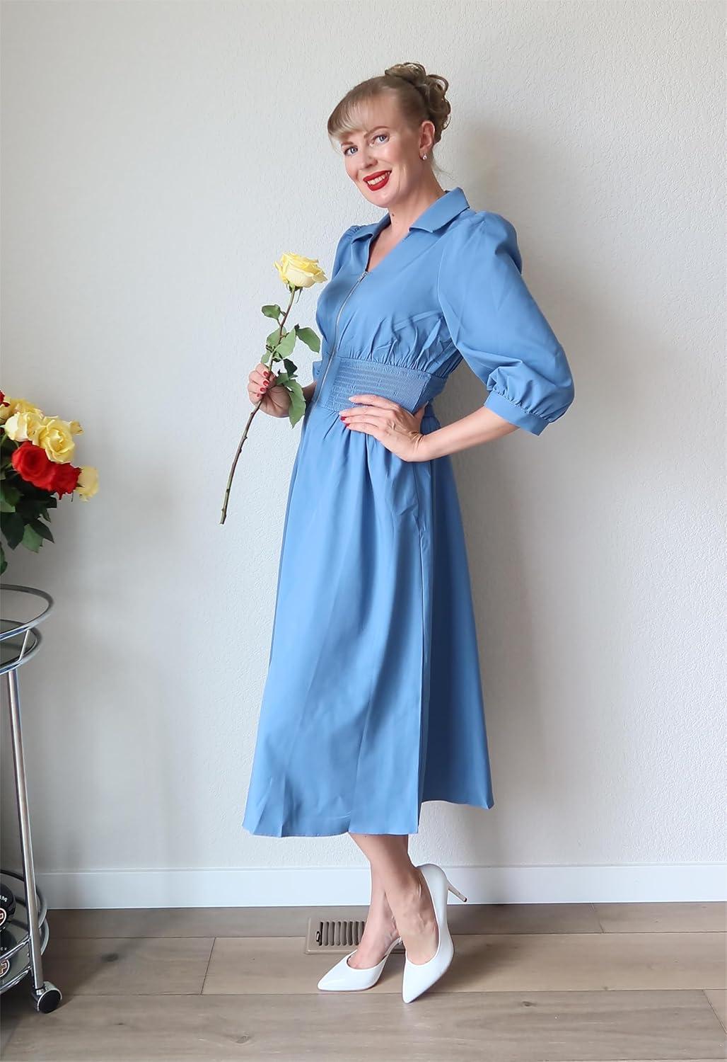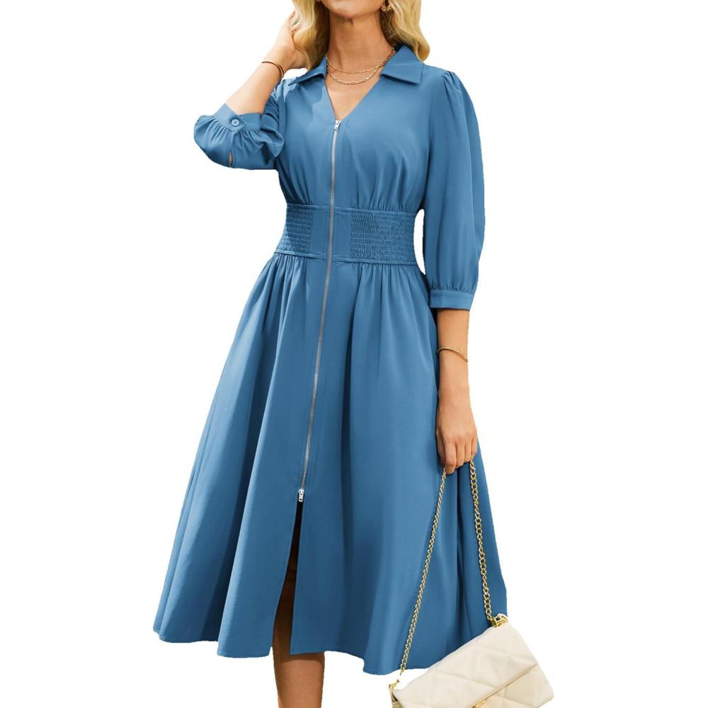 GRACE KARIN Womens Fall Casual Dress 2025 Collared V Neck 3/4 Sleeve Zipper Front Midi Work Dress with Pockets(Gray Blue)