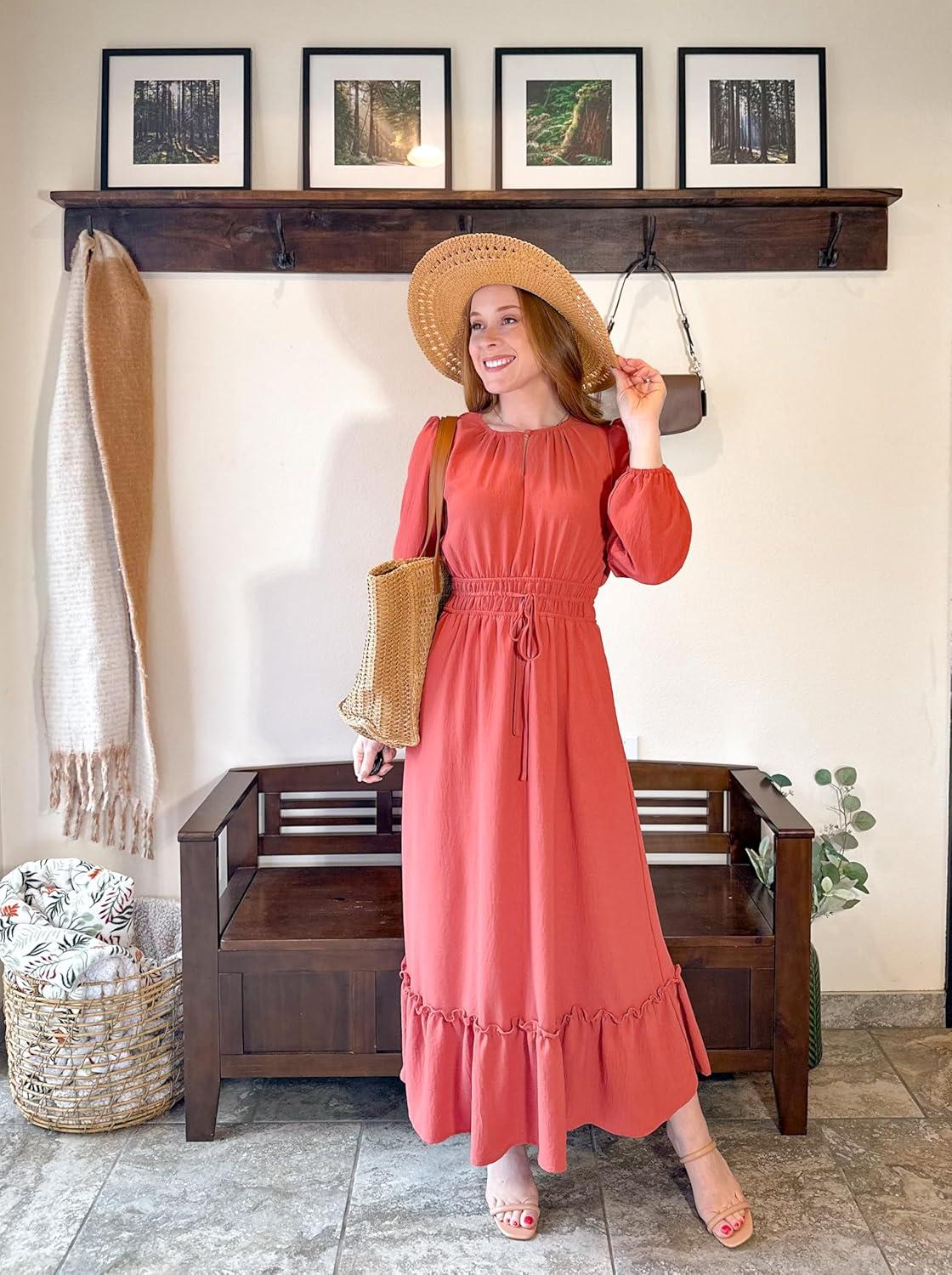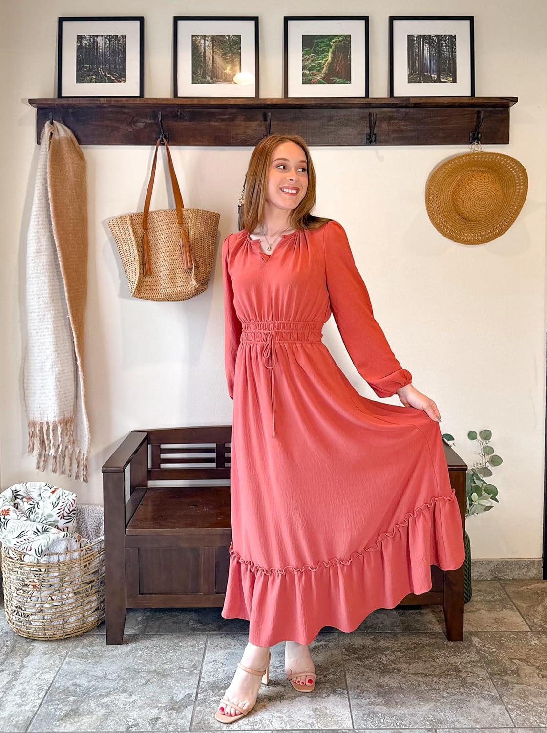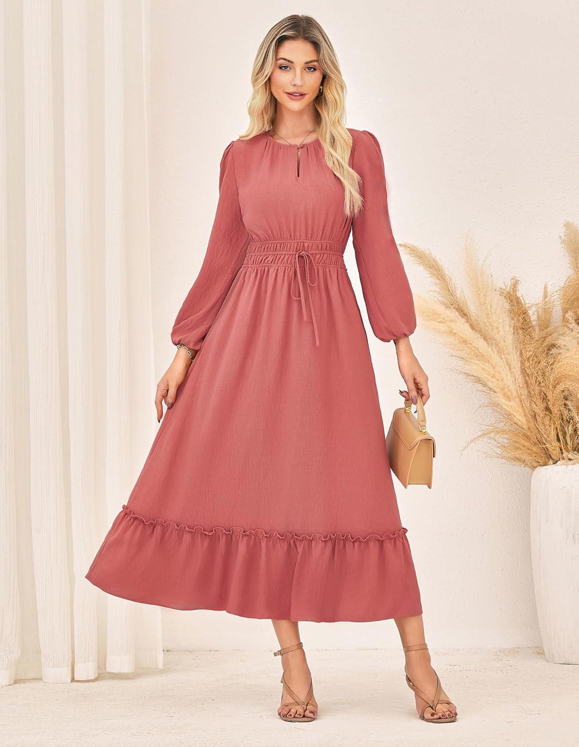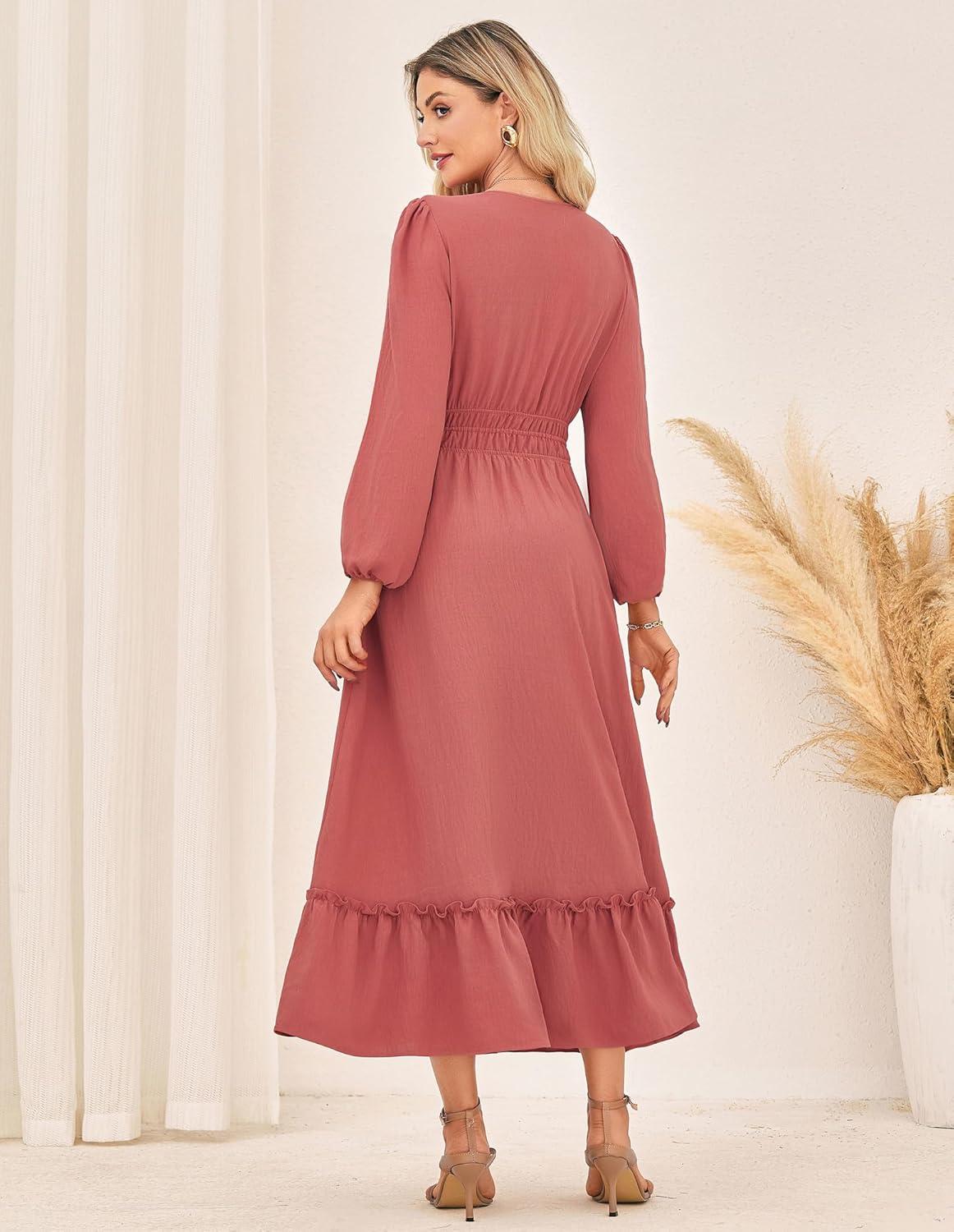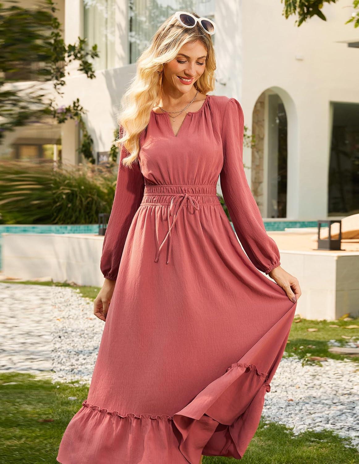 GRACE KARIN Women's Fall Dresses 2025 Long Sleeve Casual Maxi Boho Long Dress High Waisted A-Line Ruffle Dress Elegant Classy(Begonia Red)
