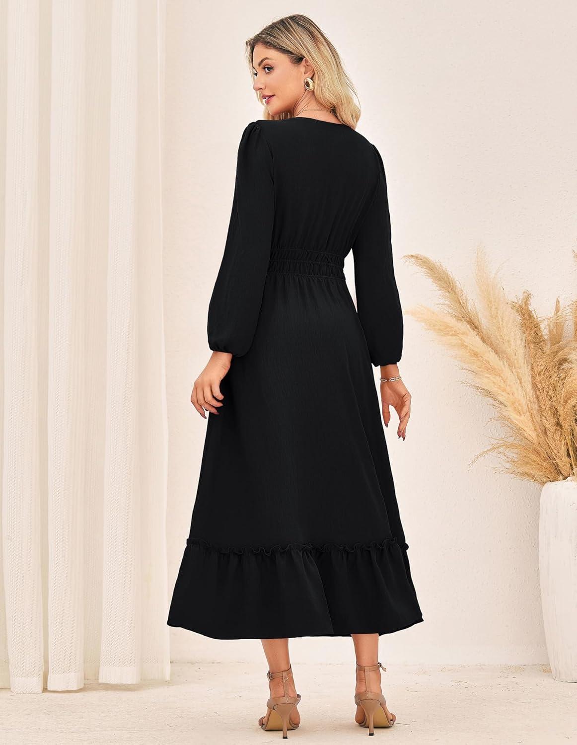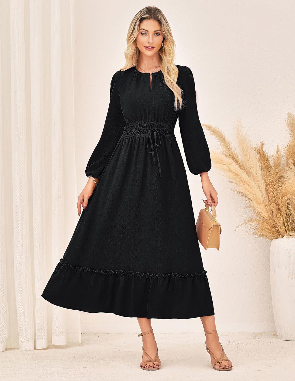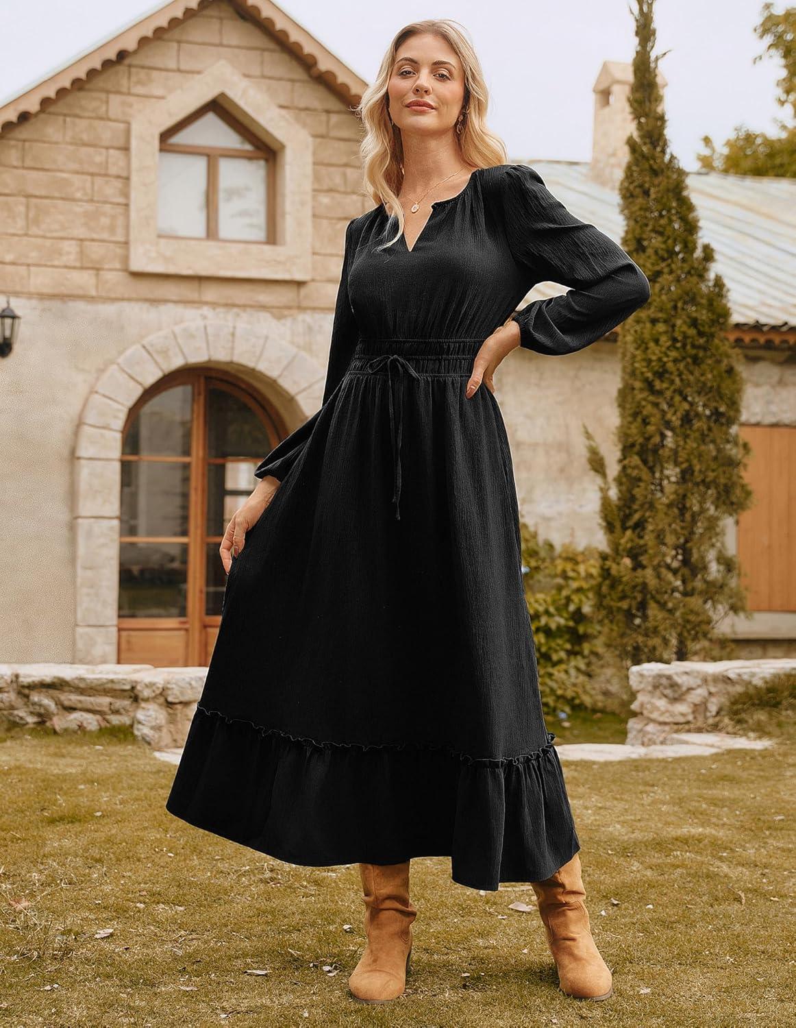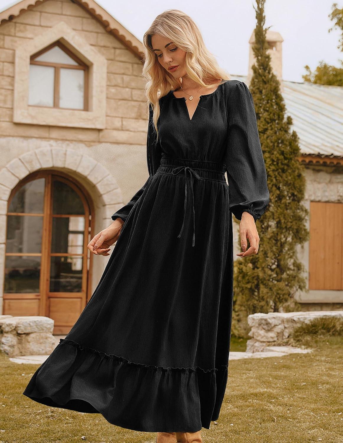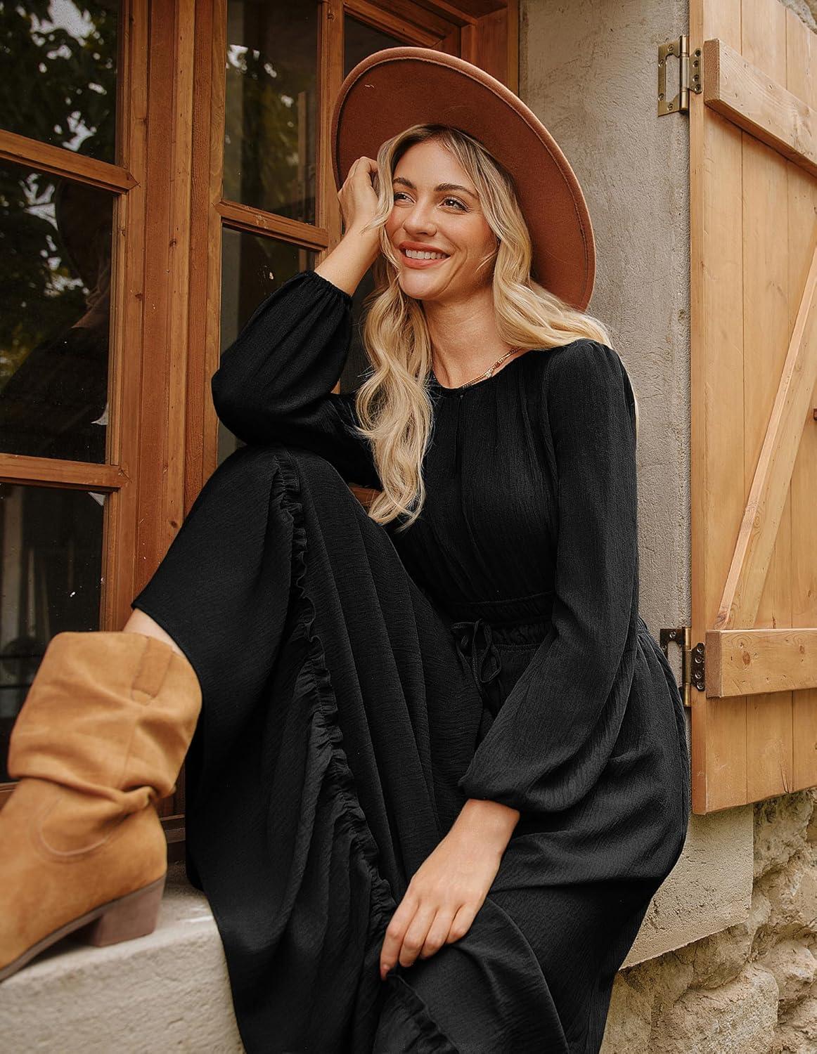 GRACE KARIN Women's Fall Dresses 2025 Long Sleeve Casual Maxi Boho Long Dress High Waisted A-Line Ruffle Dress Elegant Classy(Black)