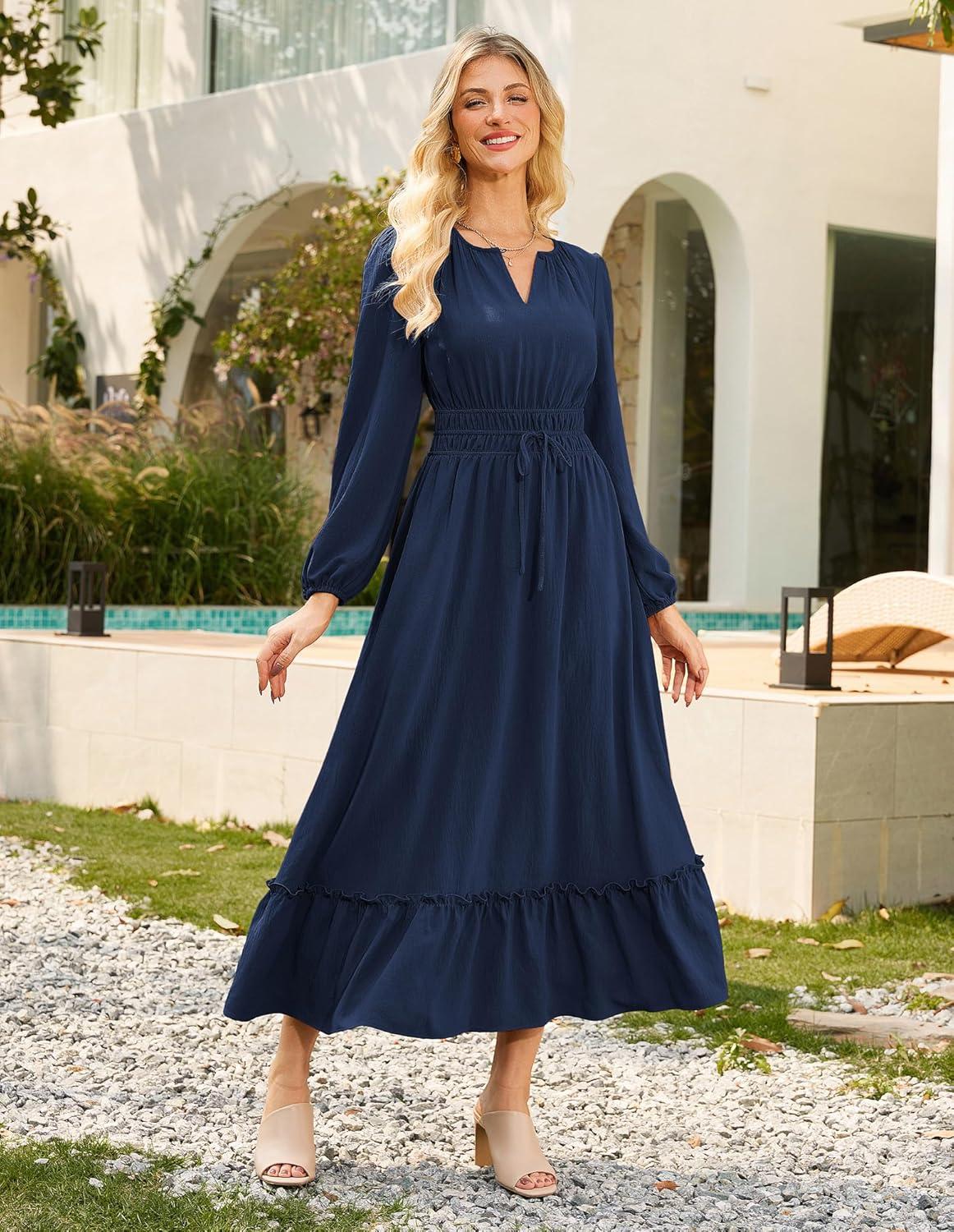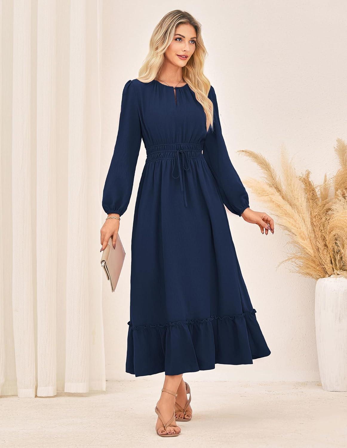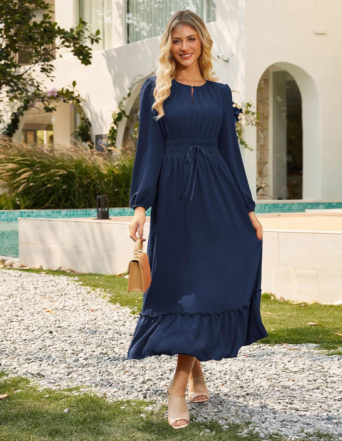GRACE KARIN Women's Fall Dresses 2025 Long Sleeve Casual Maxi Boho Long Dress High Waisted A-Line Ruffle Dress Elegant Classy(Navy Blue)