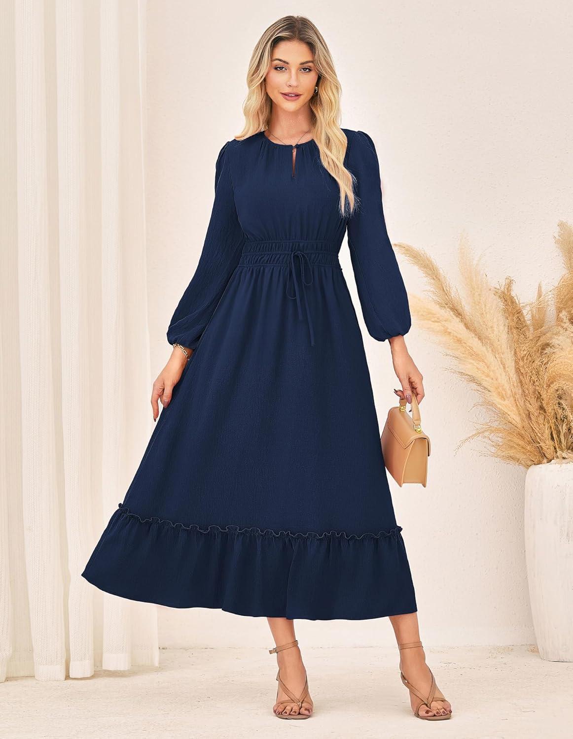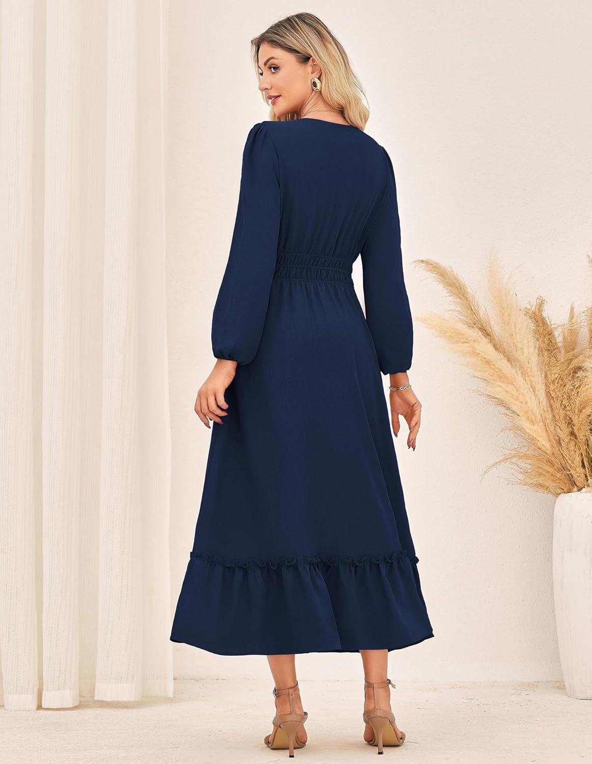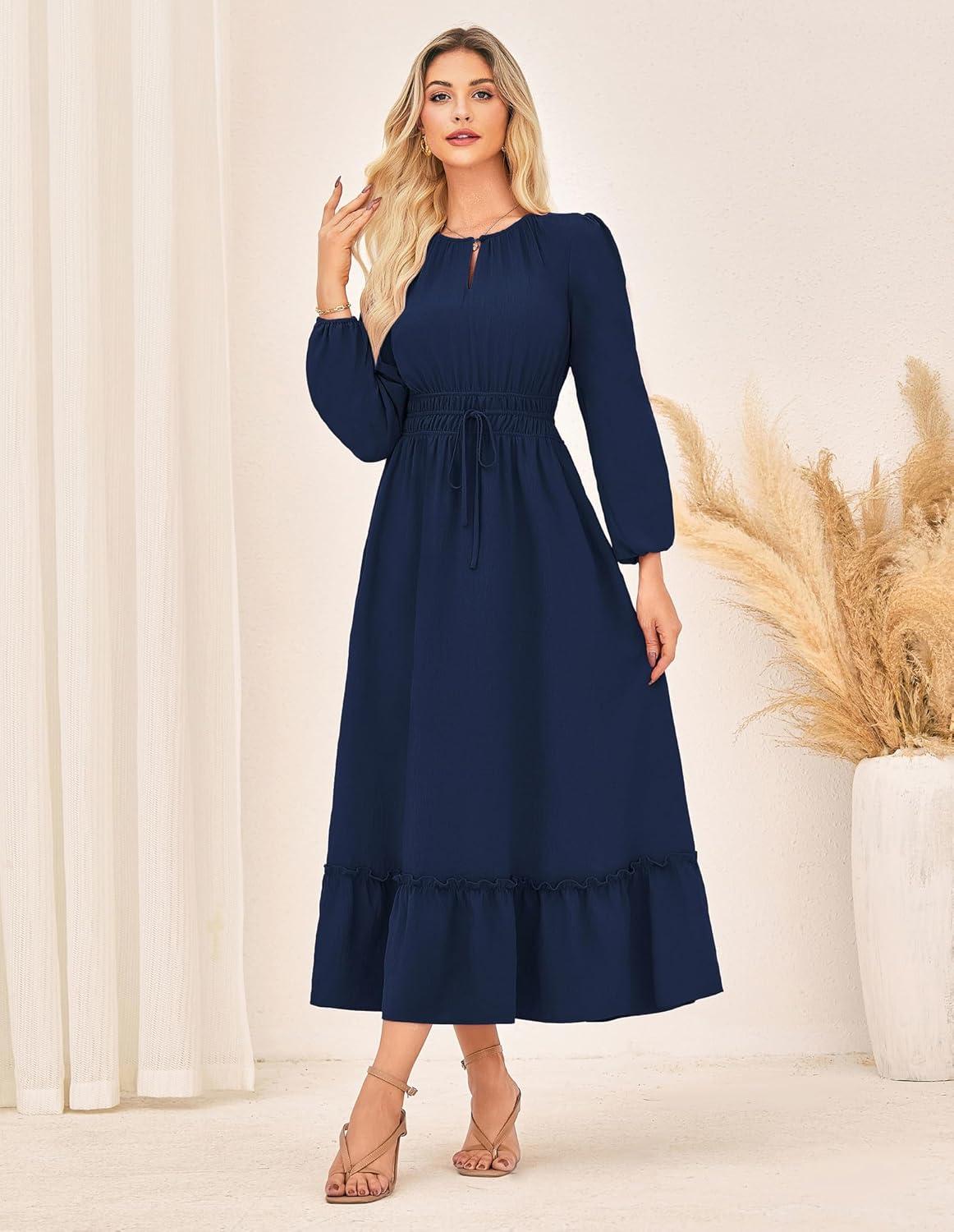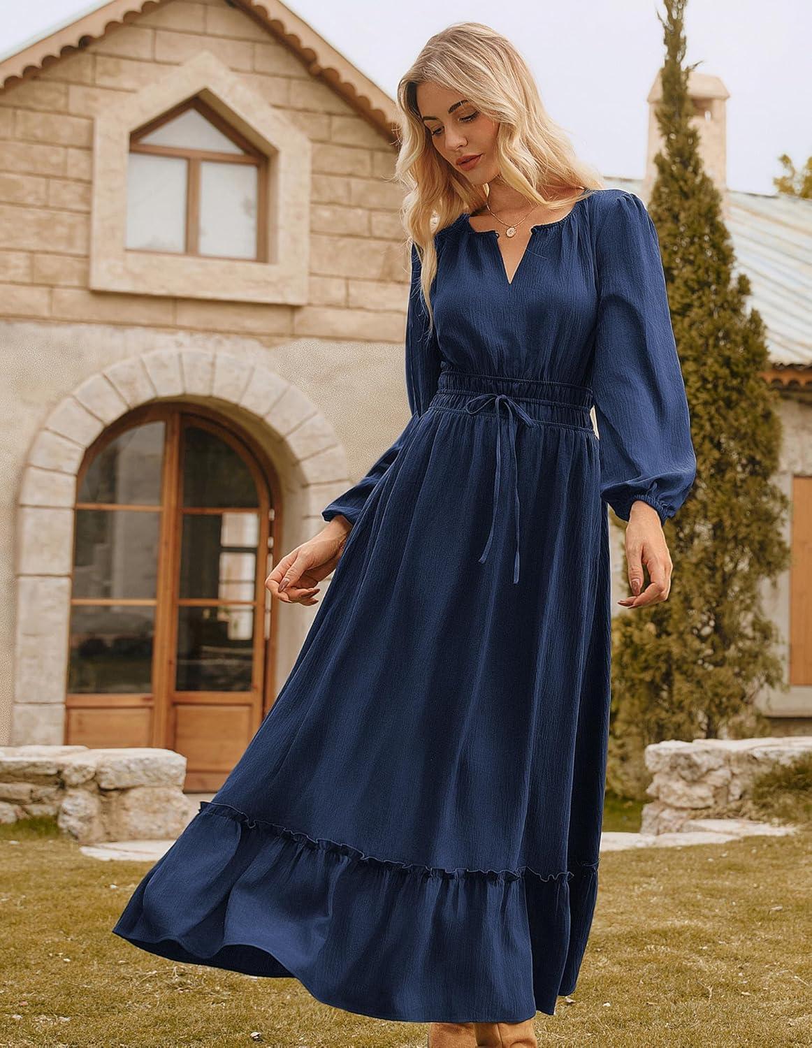 GRACE KARIN Women's Fall Dresses 2025 Long Sleeve Casual Maxi Boho Long Dress High Waisted A-Line Ruffle Dress Elegant Classy(Navy Blue)