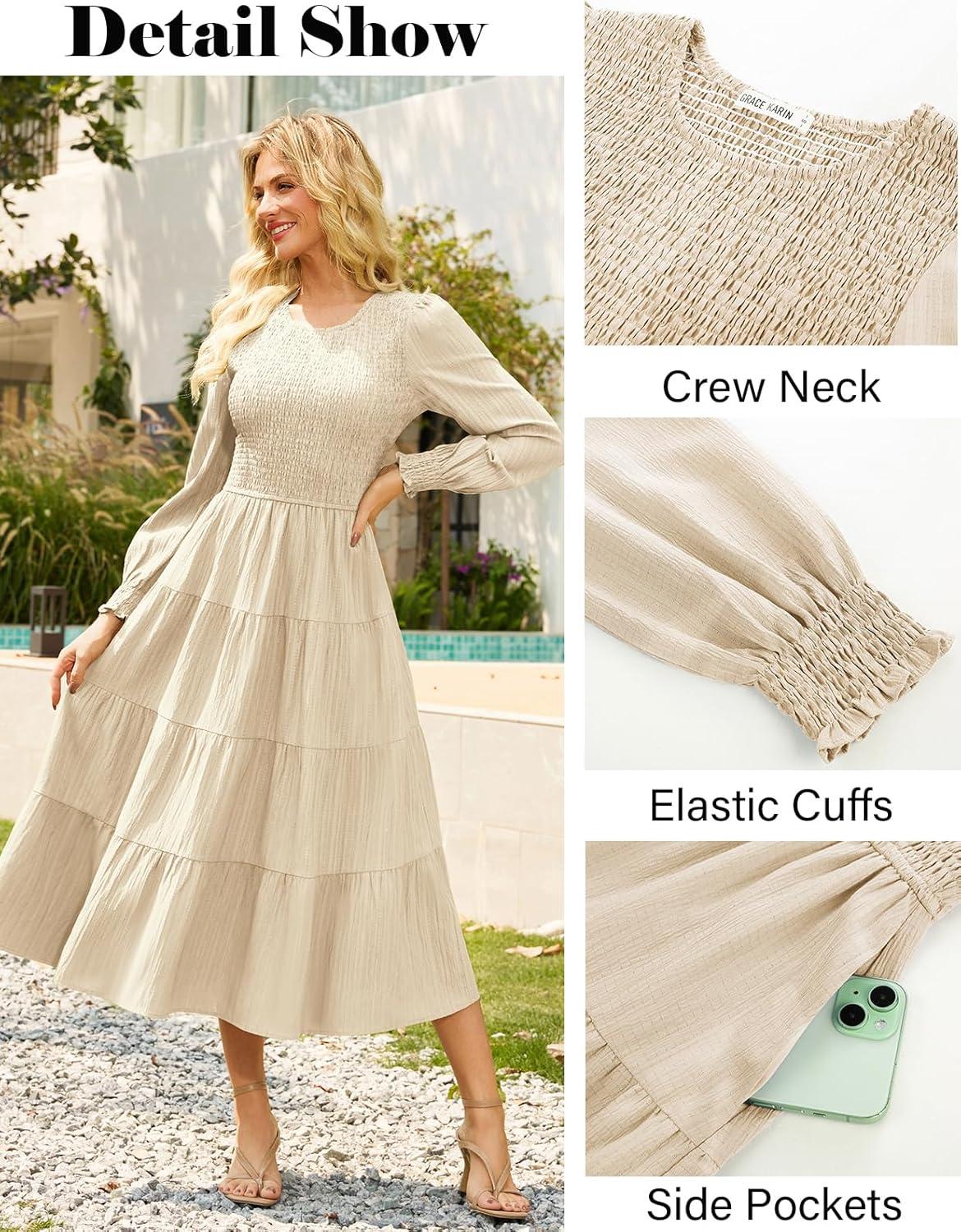 GRACE KARIN Women's Fall Long Sleeve Dresses, 2025 Wedding Guest Midi Dress, Smocked A Line Flowy Dresses with Pockets(Apricot)