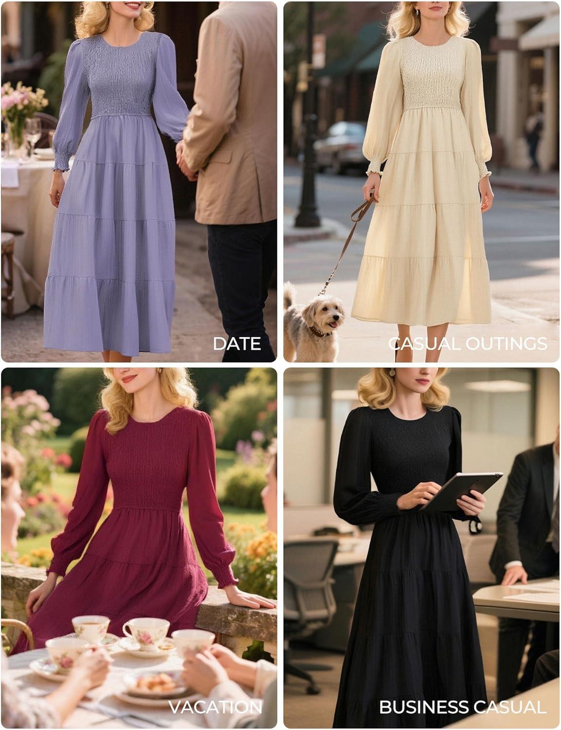 GRACE KARIN Women’s Fall Long Sleeve Dresses, 2025 Wedding Guest Midi Dress, Smocked A Line Flowy Dresses with Pockets(Black)