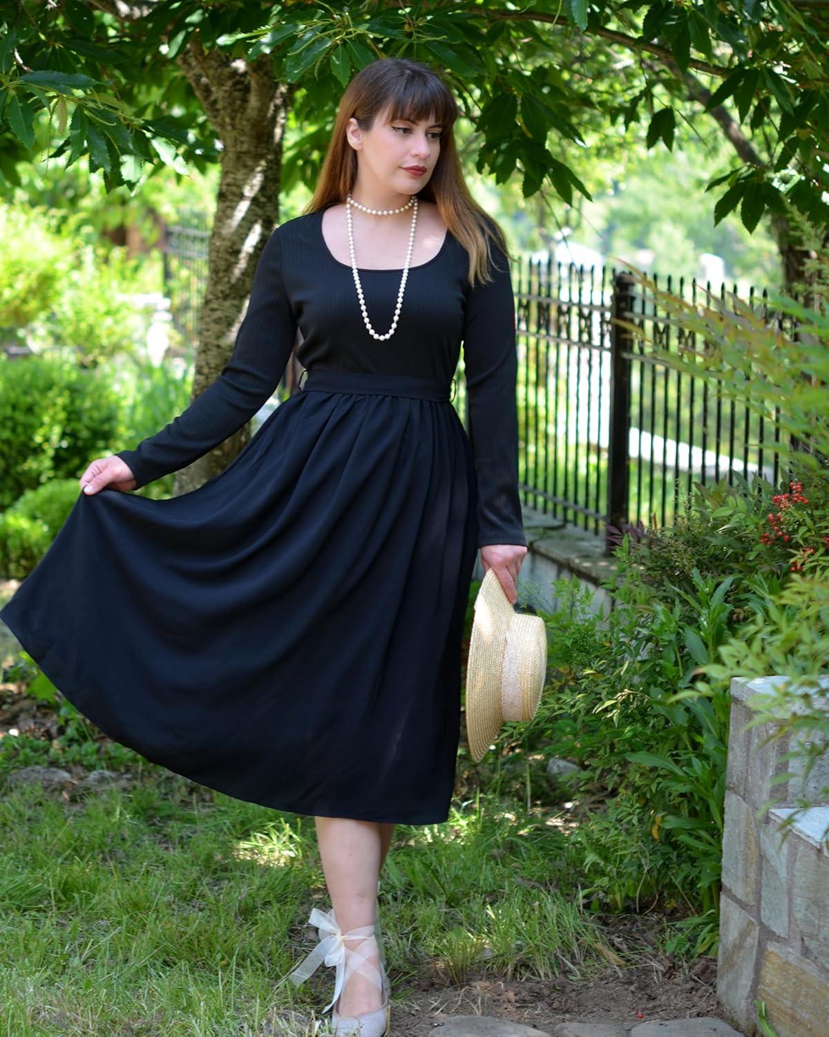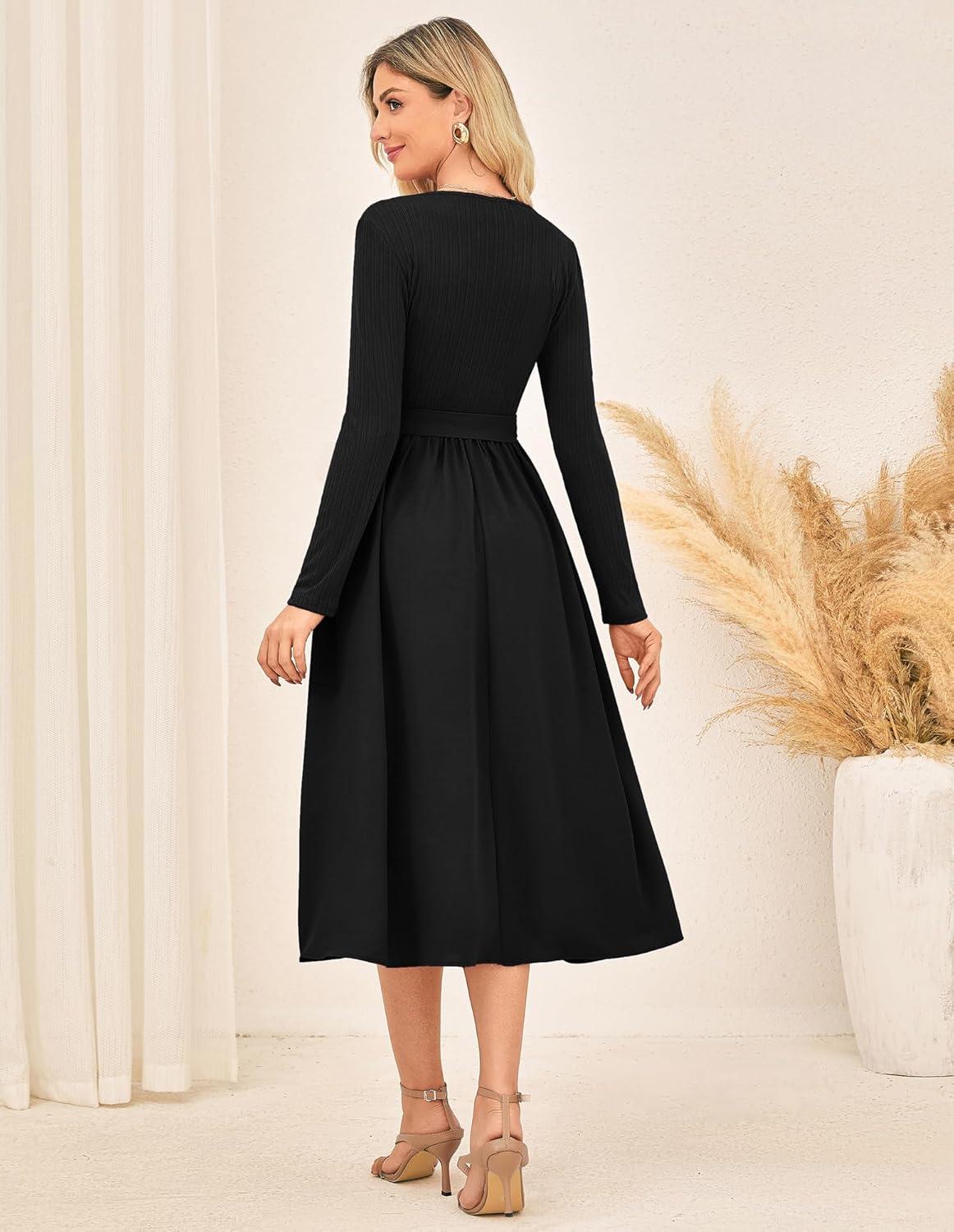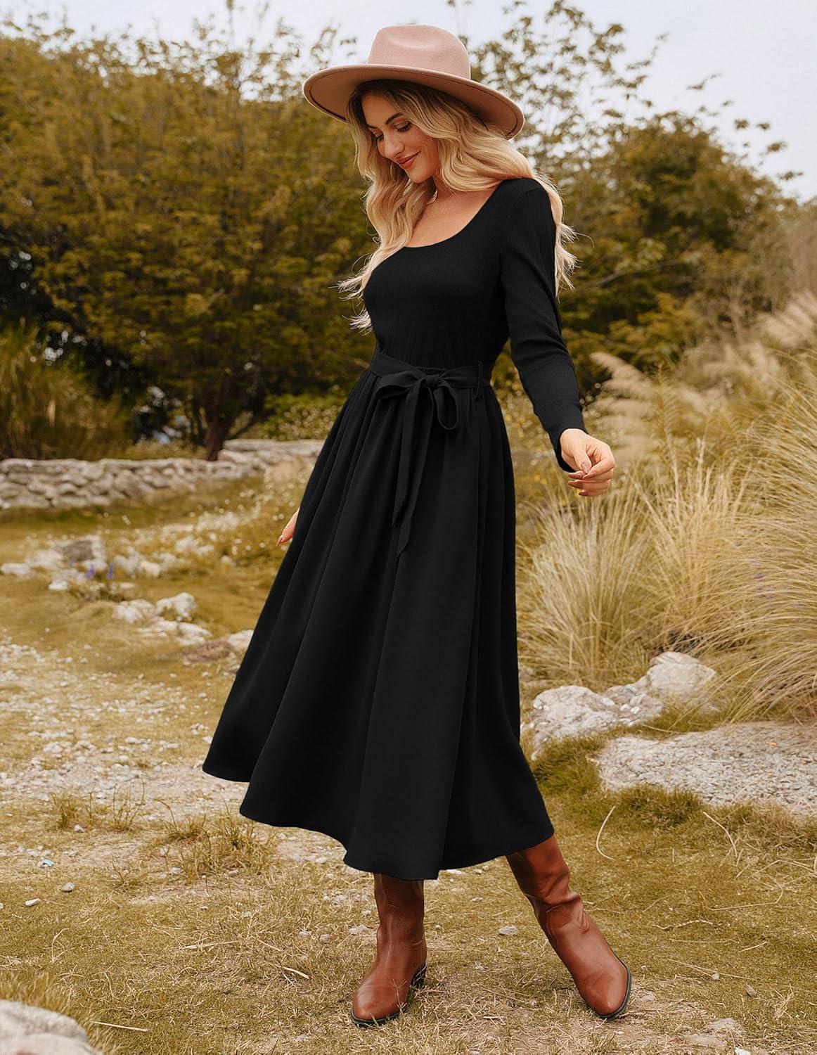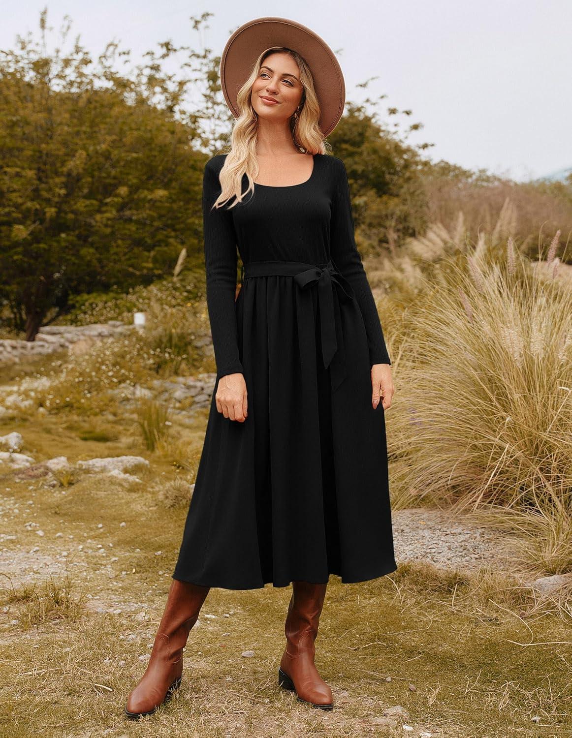GRACE KARIN Women’s Fall Long Sleeve Midi Dress 2025 Casual Square Neck Knit Belted A Line Flowy Elegant Going Out Dresses(Black)