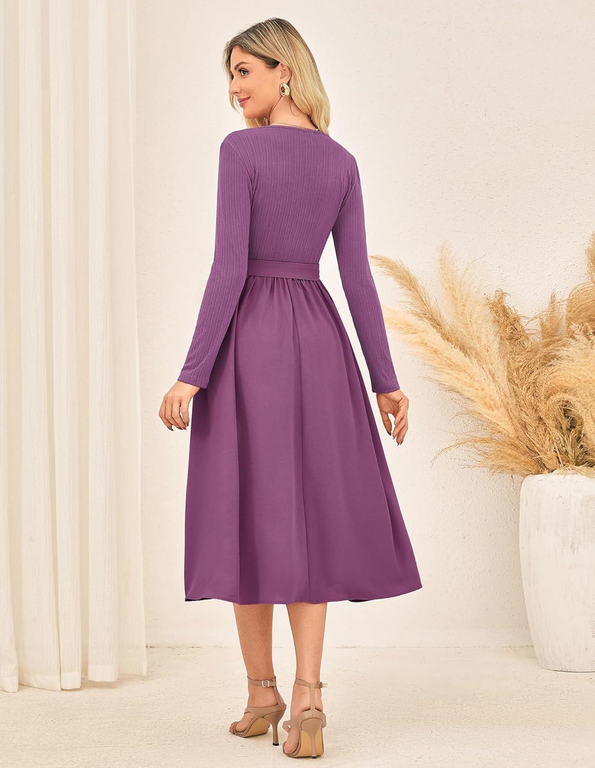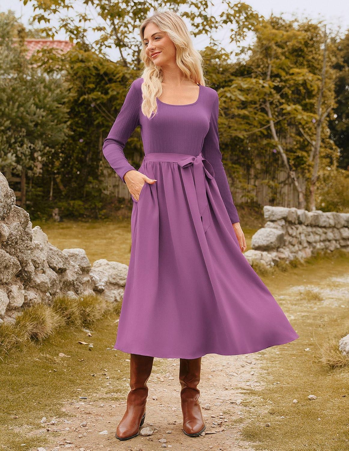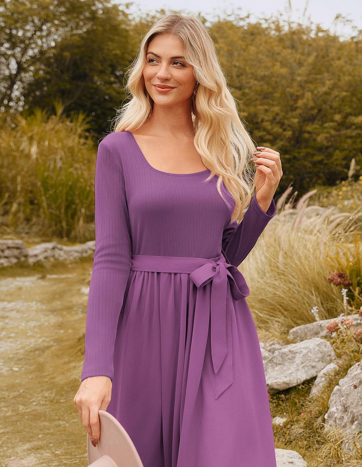 GRACE KARIN Women’s Fall Long Sleeve Midi Dress 2025 Casual Square Neck Knit Belted A Line Flowy Elegant Going Out Dresses(Purple)