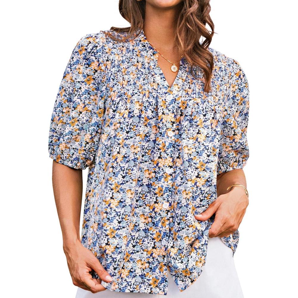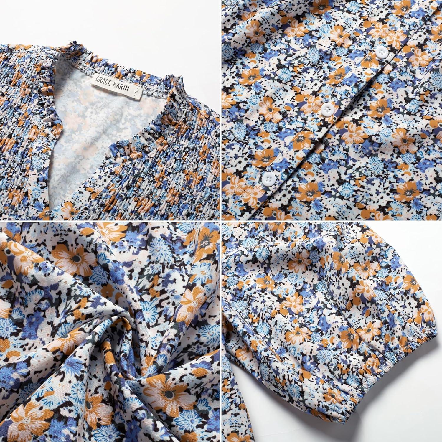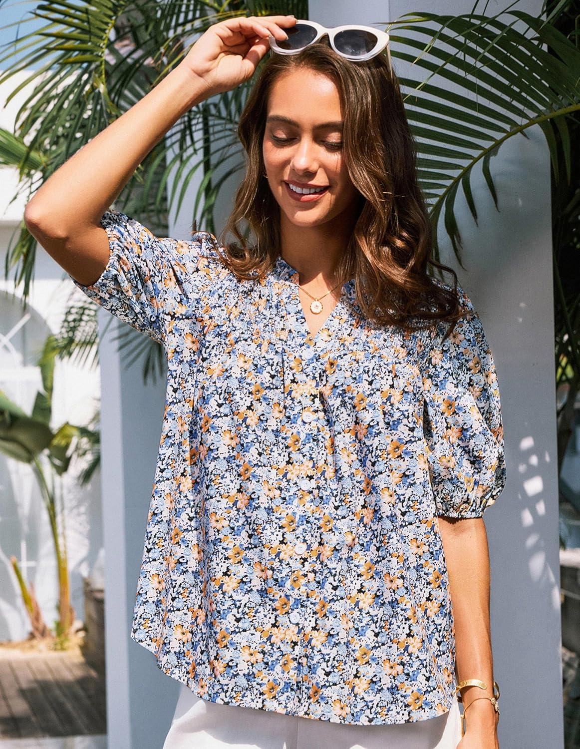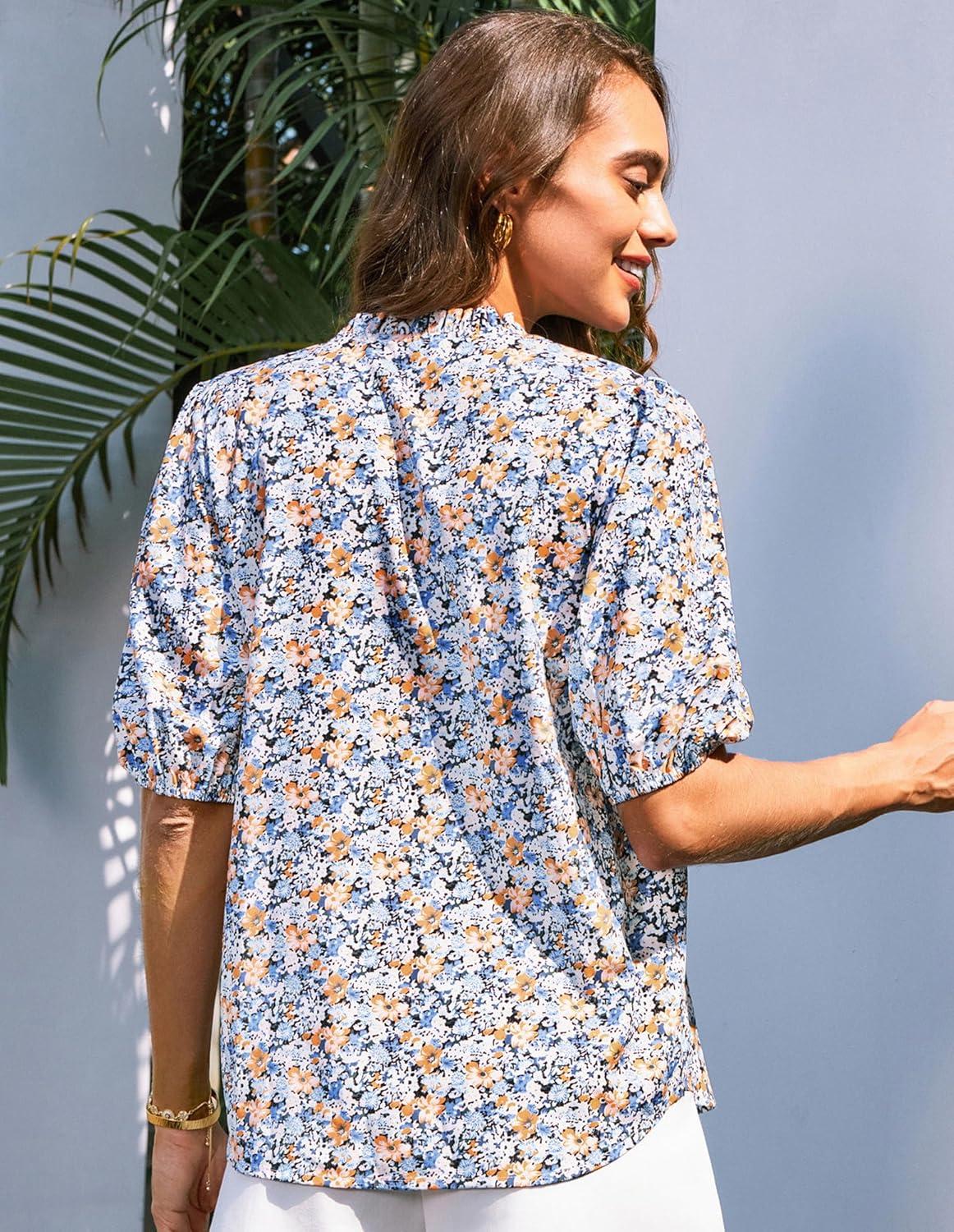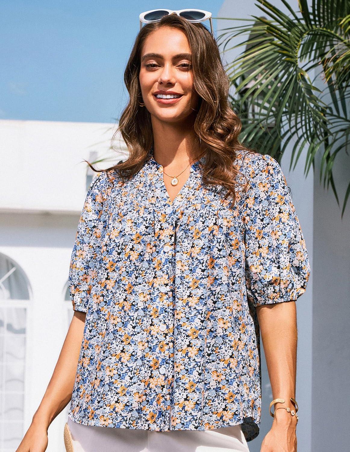 GRACE KARIN Womens Floral Button Down Shirts 2025 Puff Half Sleeve V Neck Summer Casual Loose Chiffon Blouse Tops(Blue Floral)