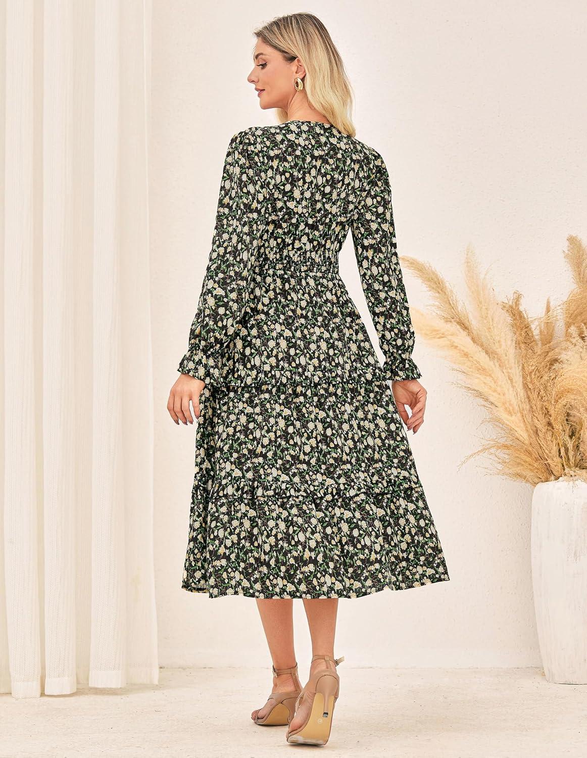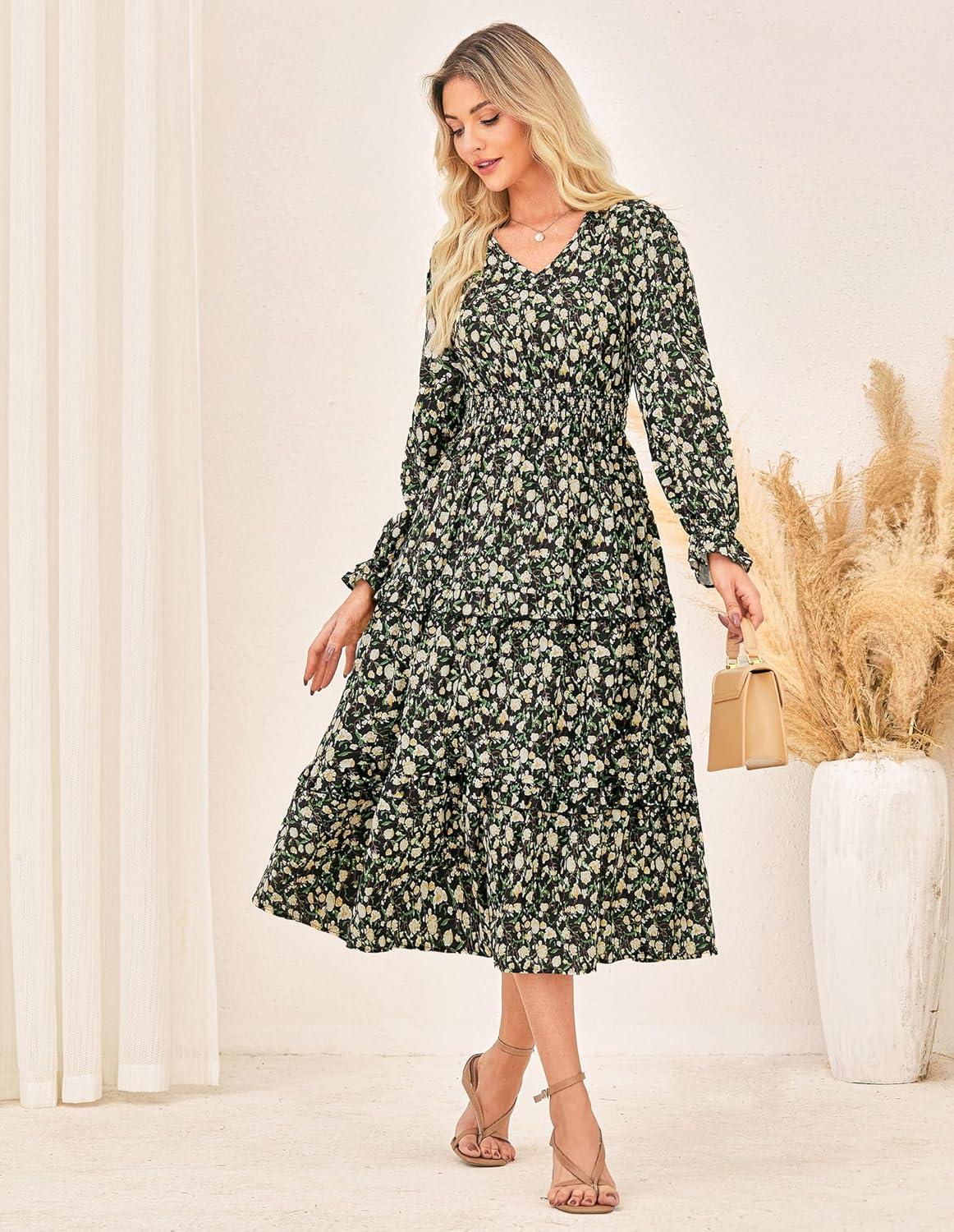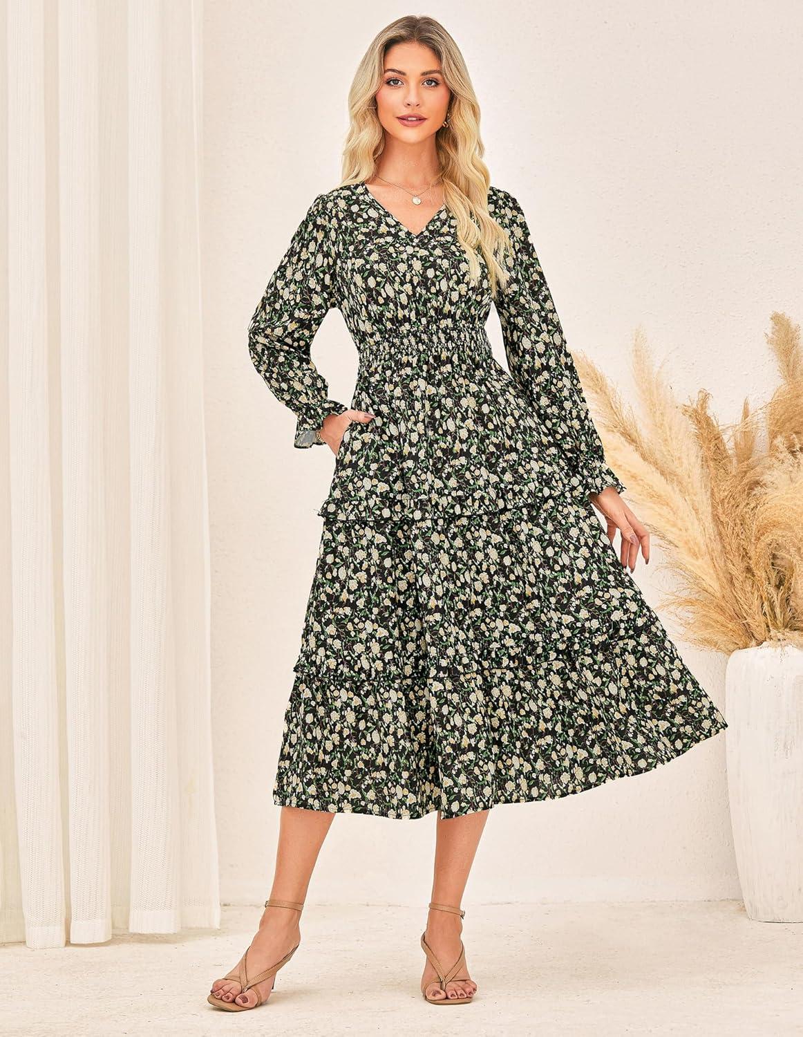 GRACE KARIN Women's Floral Maxi Dress 2025 Fall Long Sleeve Flowy V Neck A Line Dress Smocked Long Dresses with Pockets(Black Green Yellow Floral)