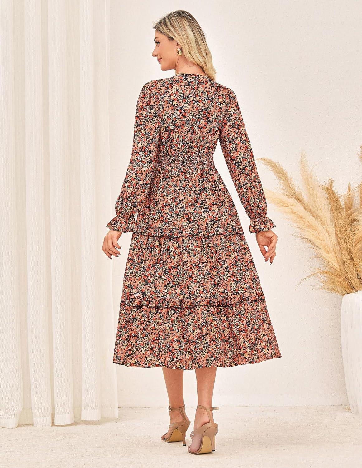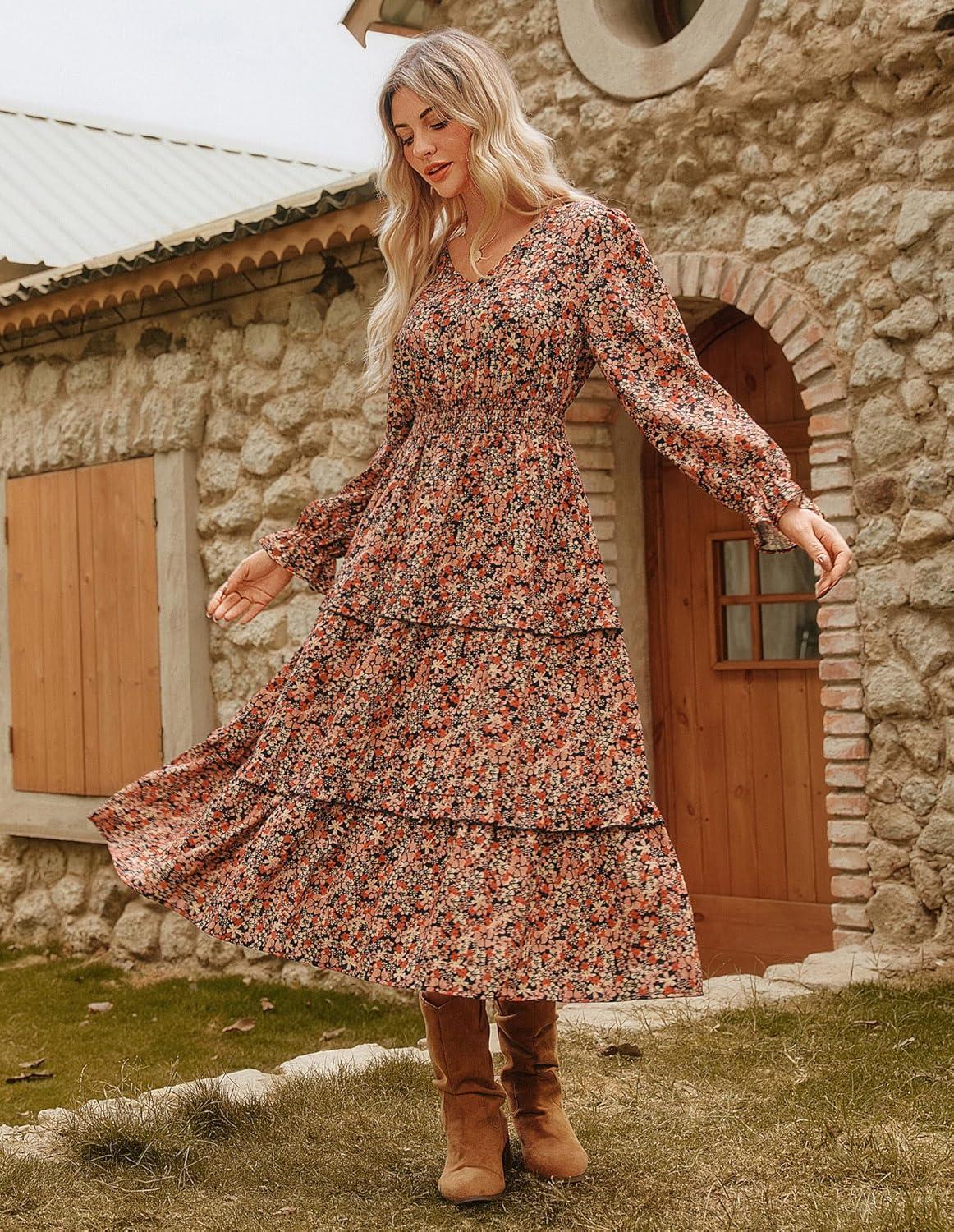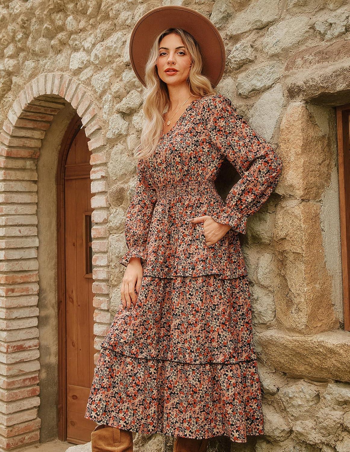 GRACE KARIN Women's Floral Maxi Dress 2025 Fall Long Sleeve Flowy V Neck A Line Dress Smocked Long Dresses with Pockets(Orange and Yellow Floral)