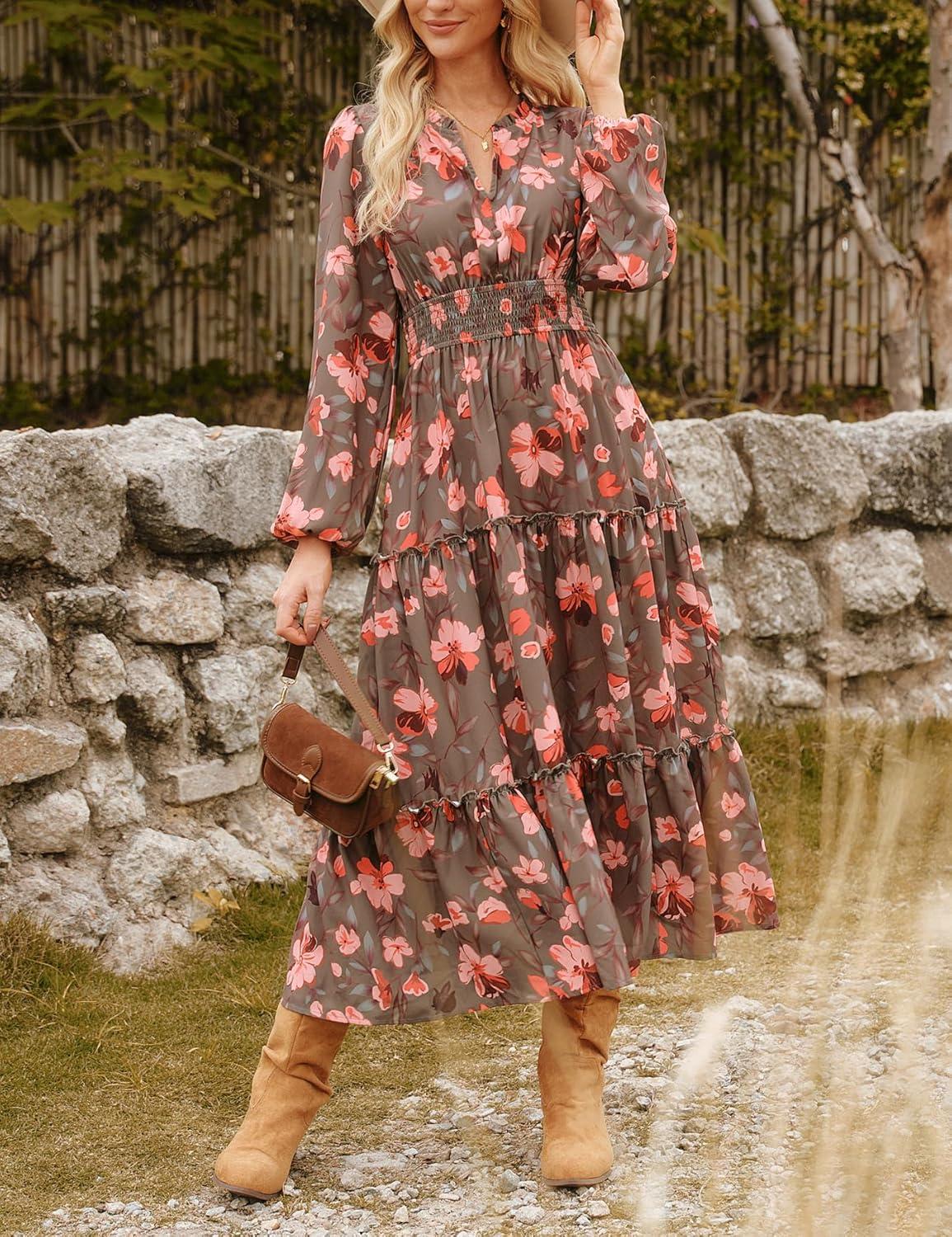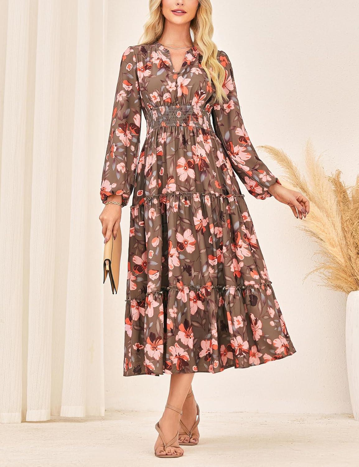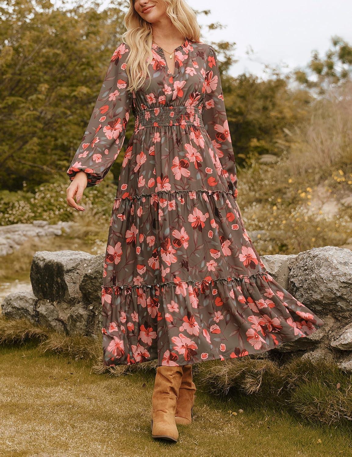 GRACE KARIN Womens 2025 Long Sleeve Floral Maxi Dress V Neck High Waist A Line Flowy Wedding Guest Dresses(Black Floral)