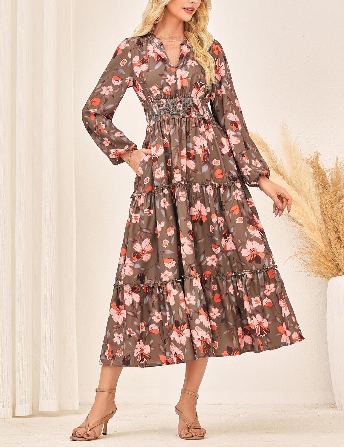 GRACE KARIN Women's Floral Maxi Dress Long Sleeve V Neck Casual A Line Spring Fall Winter Flowy Tiered Dresses with Pockets(Green Orange)