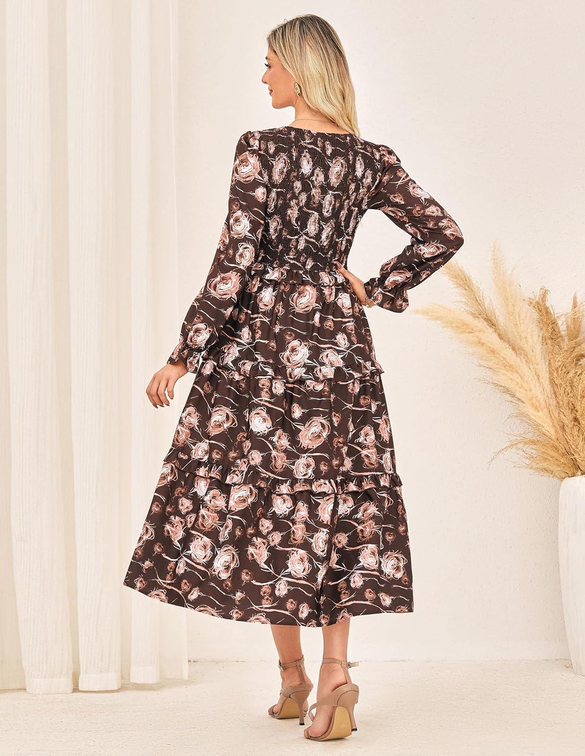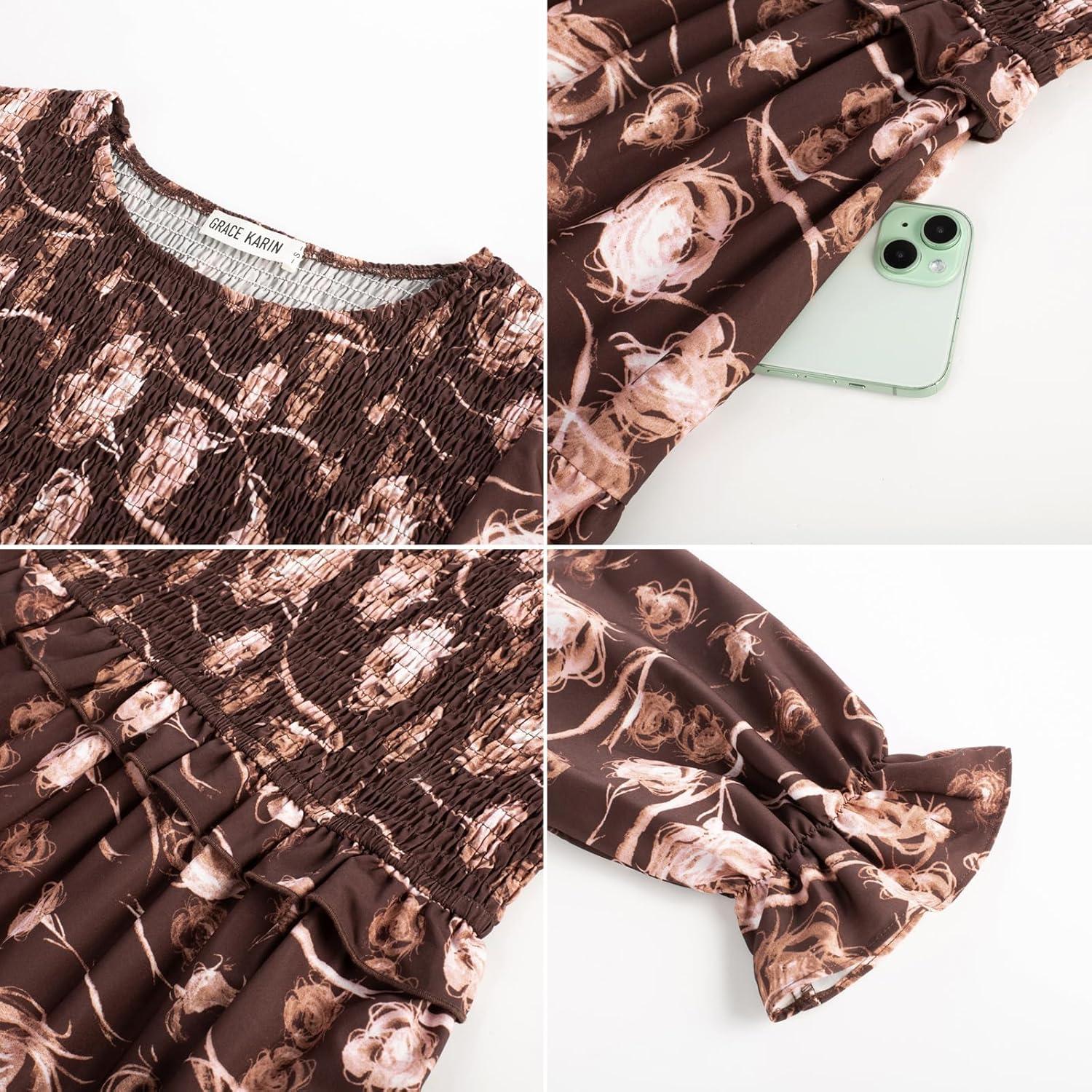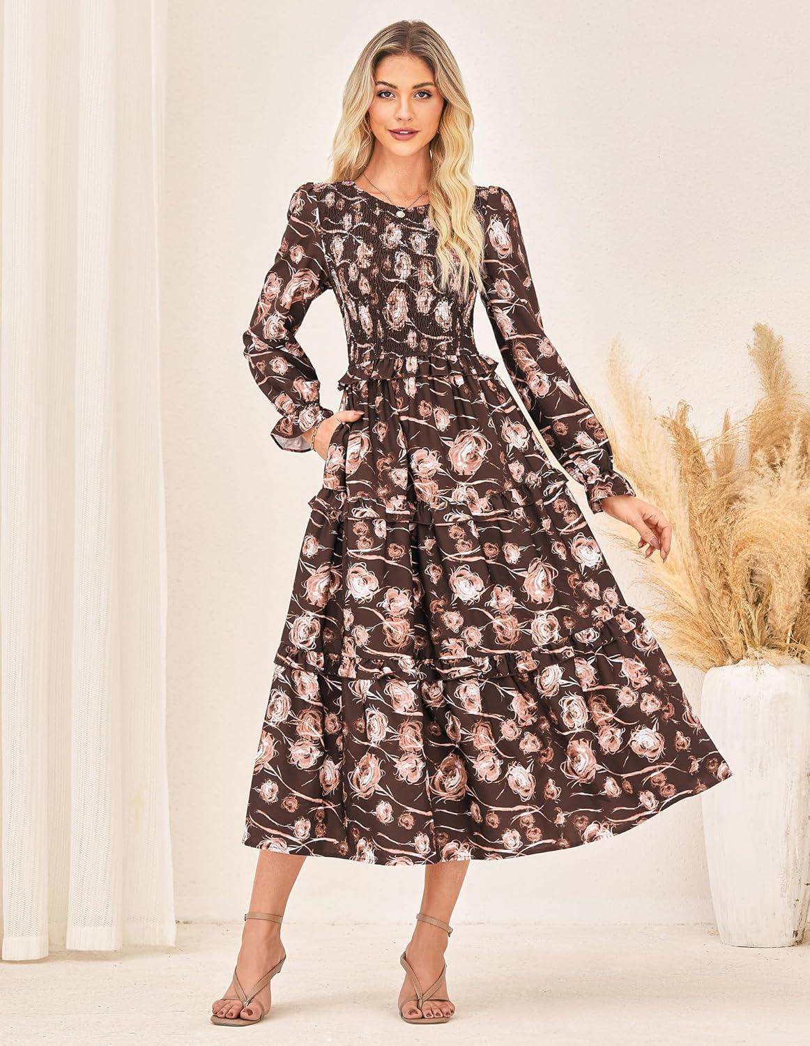 GRACE KARIN Women's Floral Midi Dress 2025 Long Sleeve Fall Elegant Smocked Tiered Flowy Wedding Guest Dresses with Pockets(Brown White)
