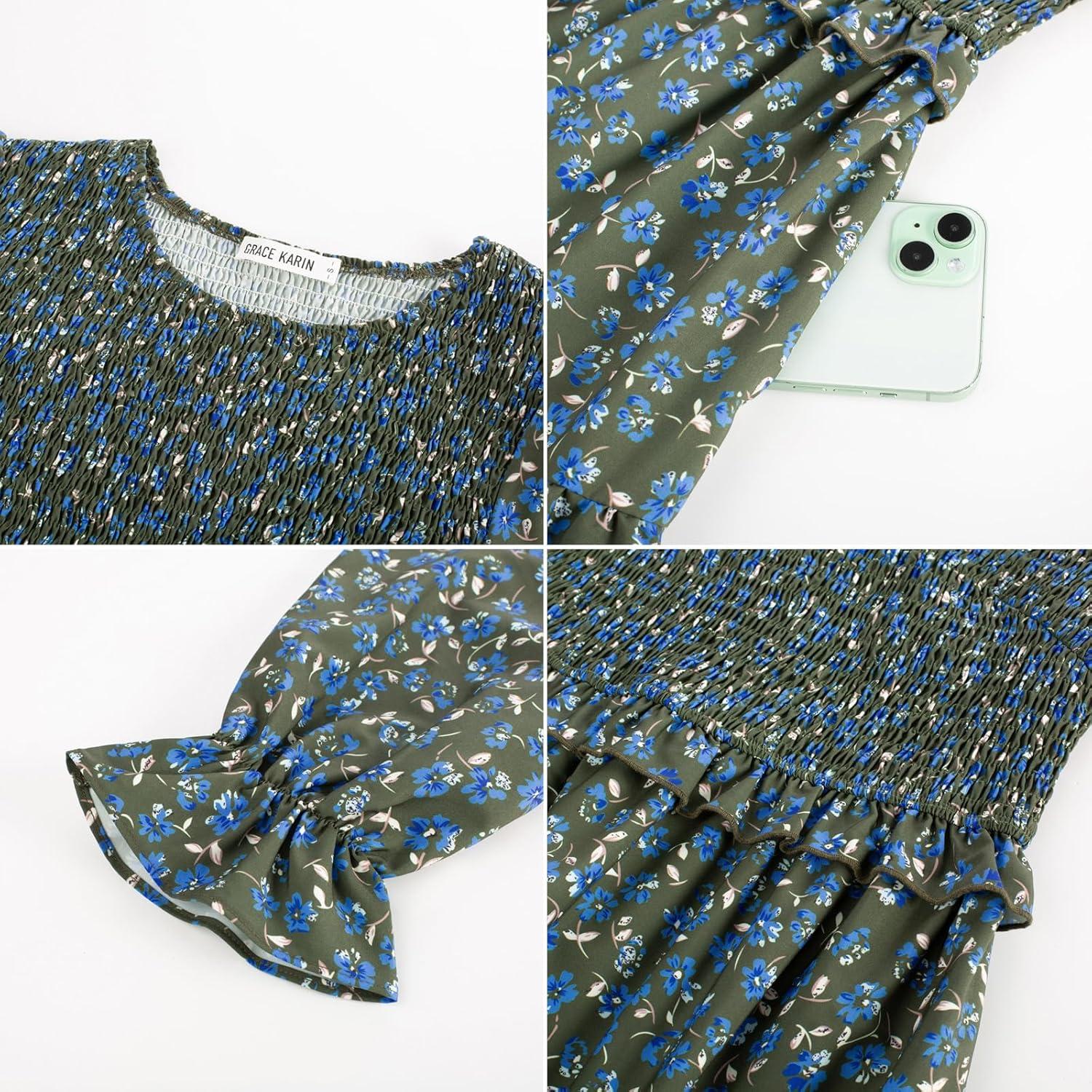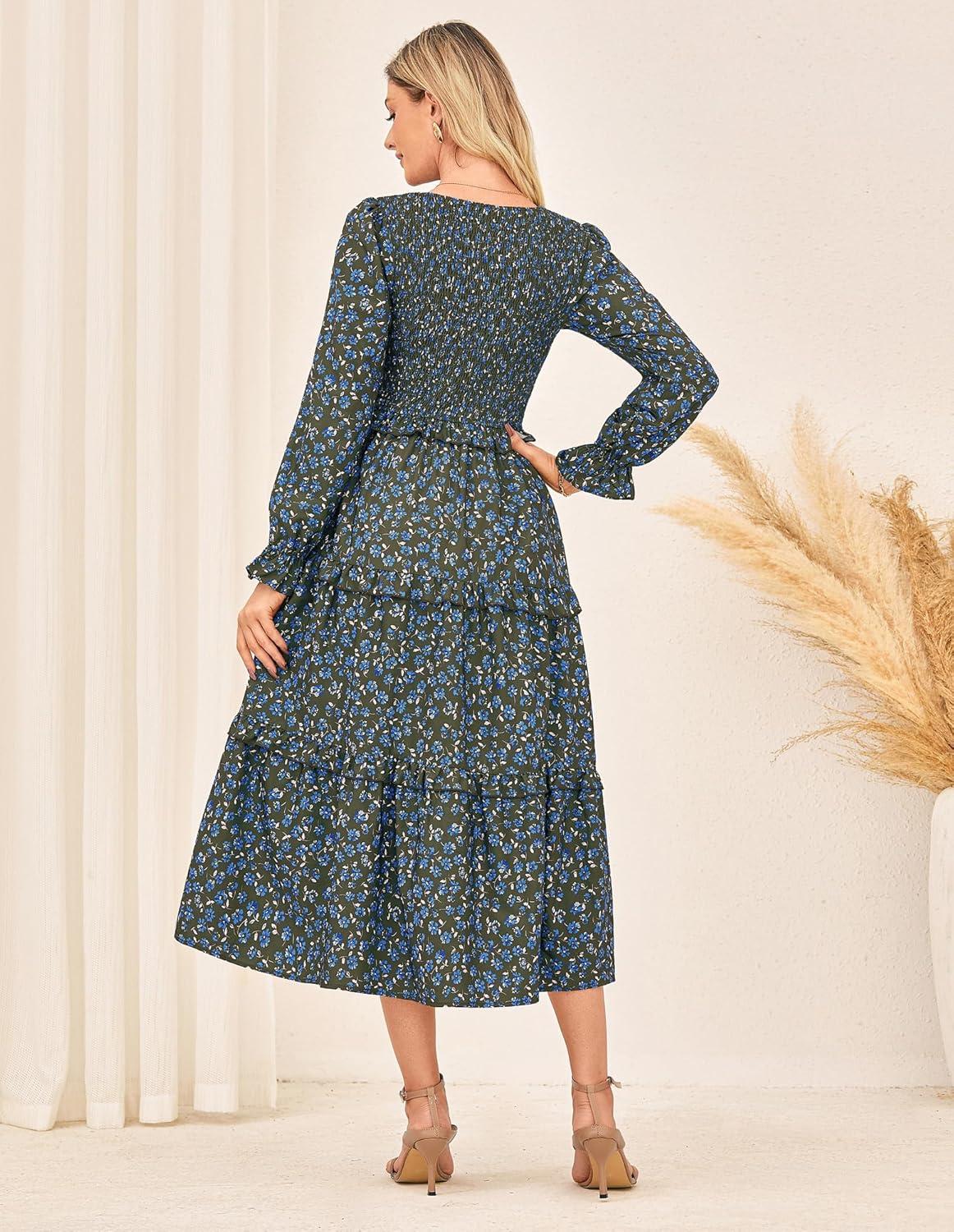 GRACE KARIN Women’s Floral Midi Dress 2025 Long Sleeve Fall Elegant Smocked Tiered Flowy Wedding Guest Dresses with Pockets(Dark Green Blue)
