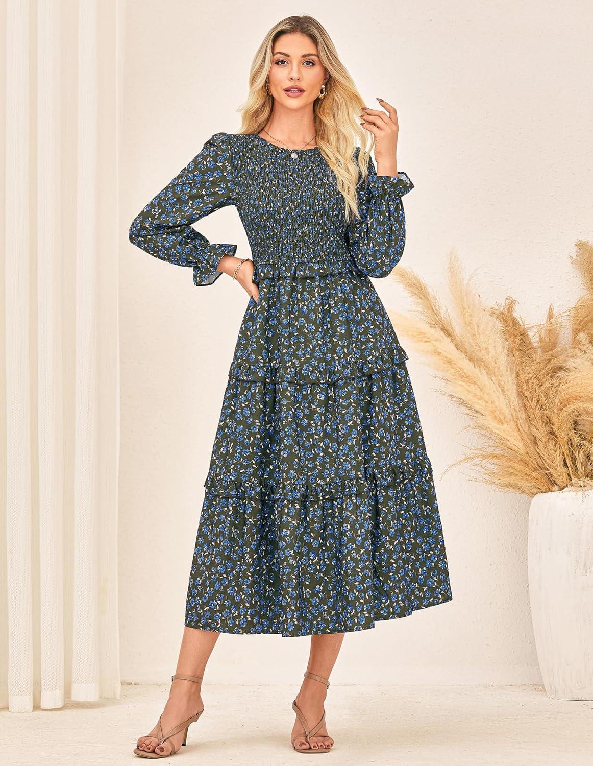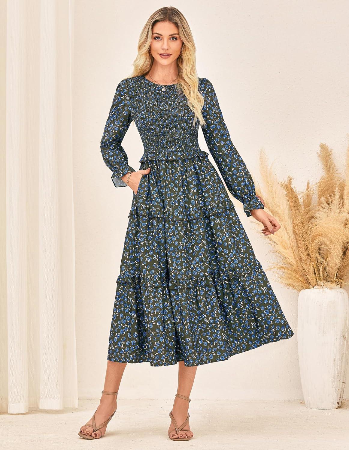 GRACE KARIN Women's Floral Midi Dress 2025 Long Sleeve Fall Elegant Smocked Tiered Flowy Wedding Guest Dresses with Pockets(Dark Green Blue)