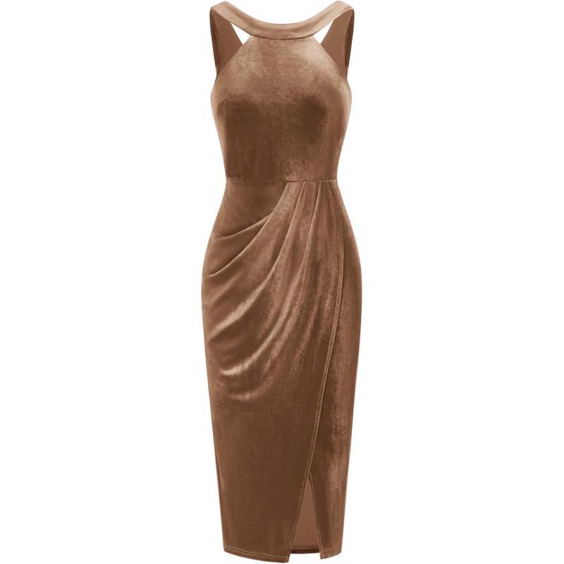 GRACE KARIN Womens Halter Neck Sleeveless Ruched Bodycon Slit Velvet Wrap Party Cocktail Midi DressChampagne