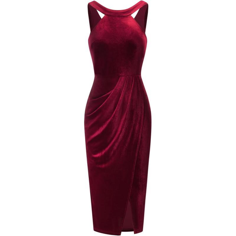 GRACE KARIN Women’s Halter Neck Sleeveless Ruched Bodycon Slit Velvet Wrap Party Cocktail Midi Dress(Wine)