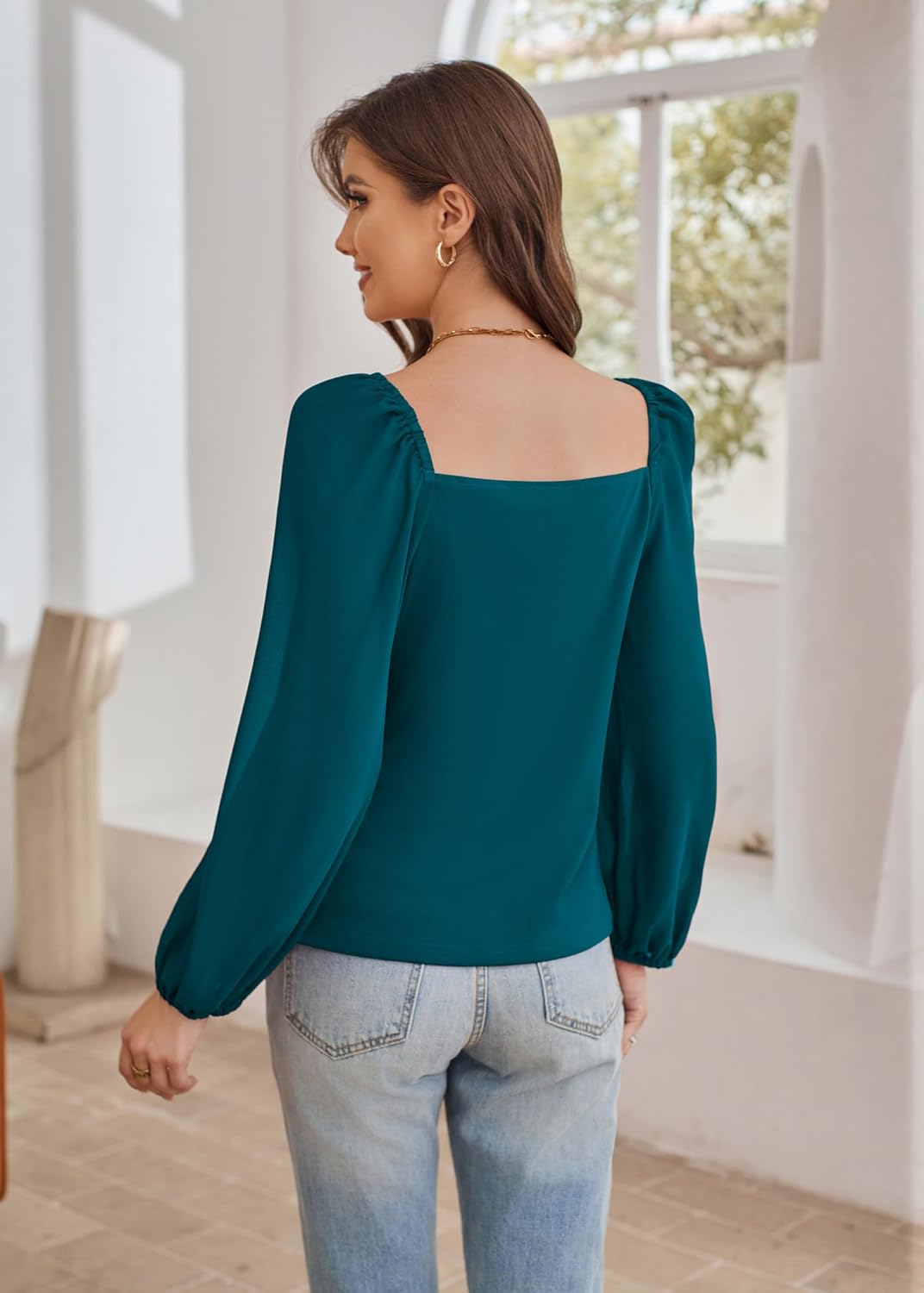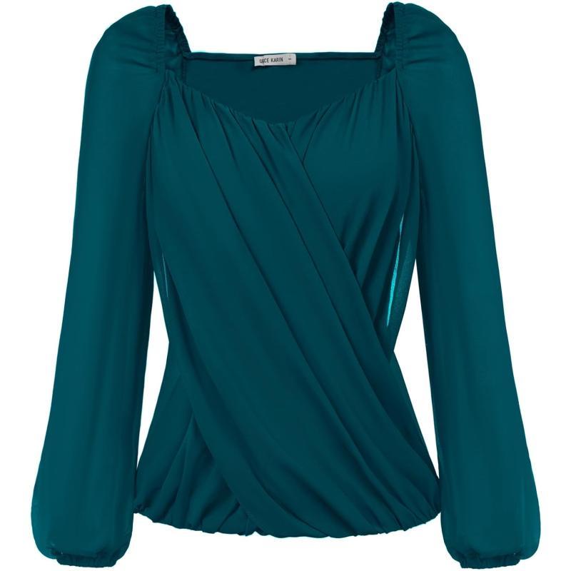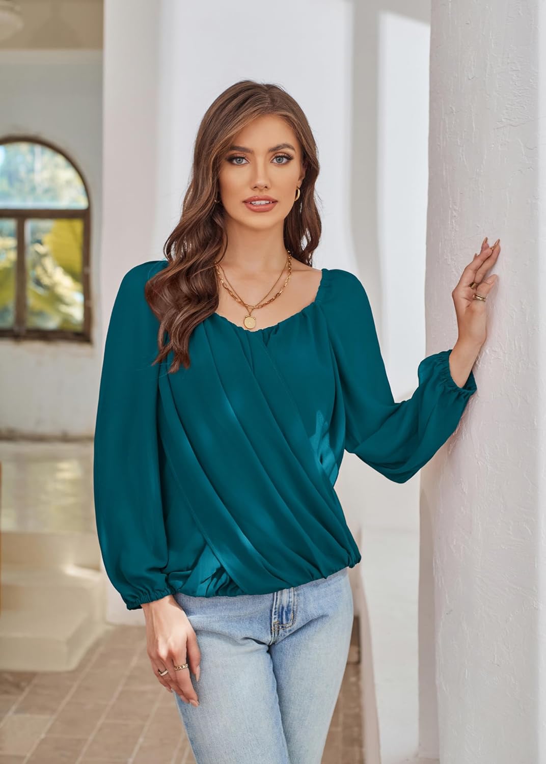 GRACE KARIN Womens Lantern Long Sleeve Tops 2023 Casual Loose Chiffon Shirts Criss Cross Ruffle Pleated BlousesTeal