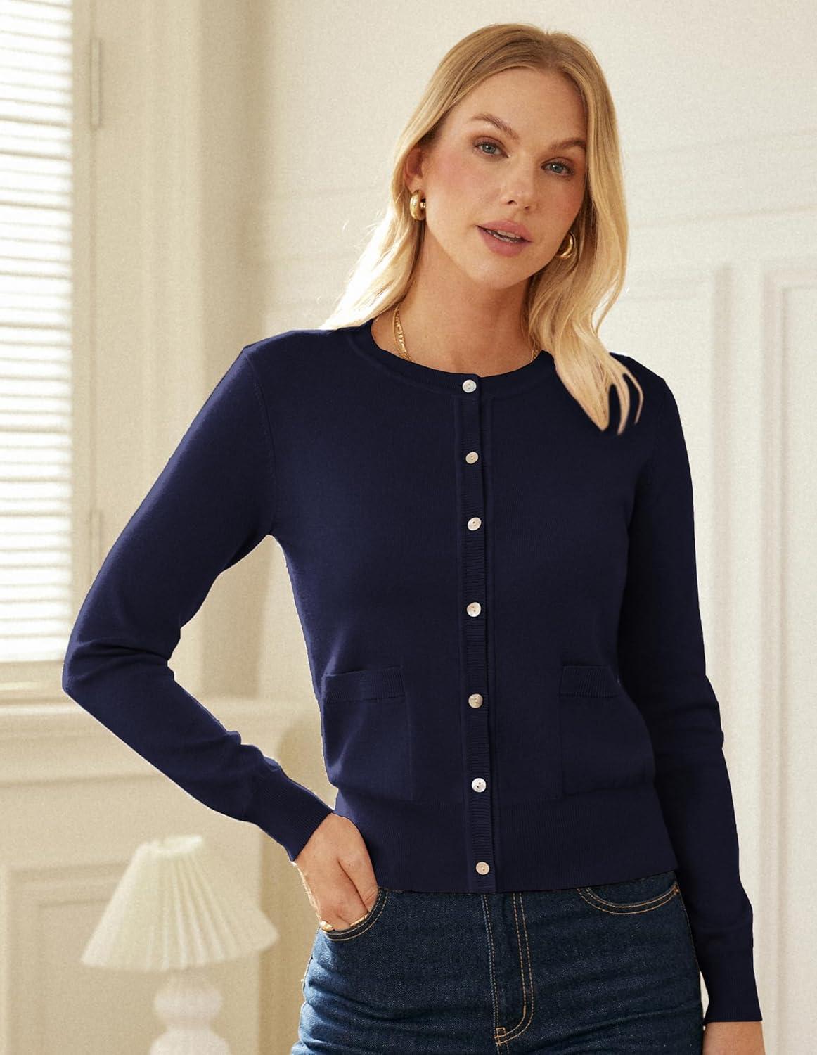 GRACE KARIN Women's Lightweight Cardigan Crew Neck Button Up Sweaters Long Sleeve Knit Cardigans with Pockets(Navy Blue)