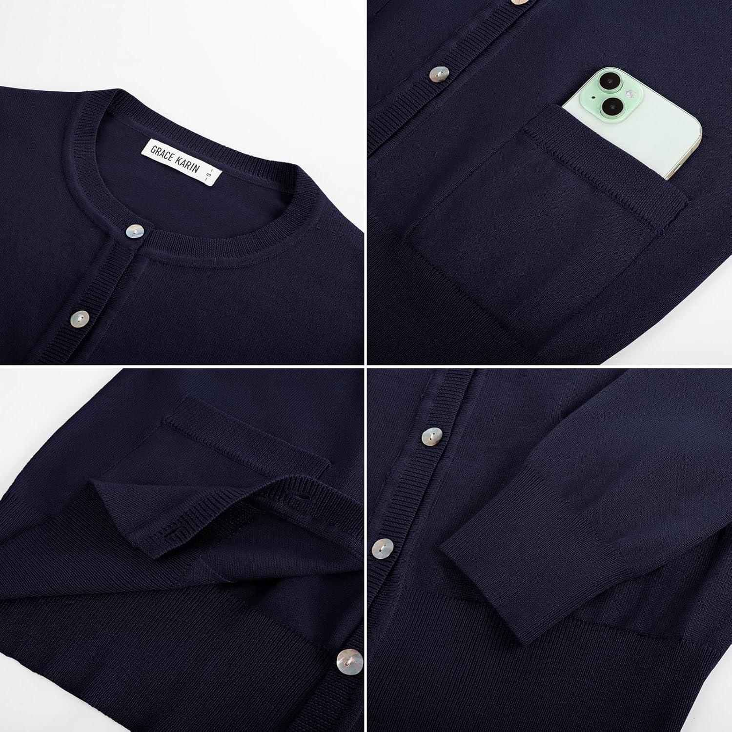 GRACE KARIN Women’s Lightweight Cardigan Crew Neck Button Up Sweaters Long Sleeve Knit Cardigans with Pockets(Navy Blue)