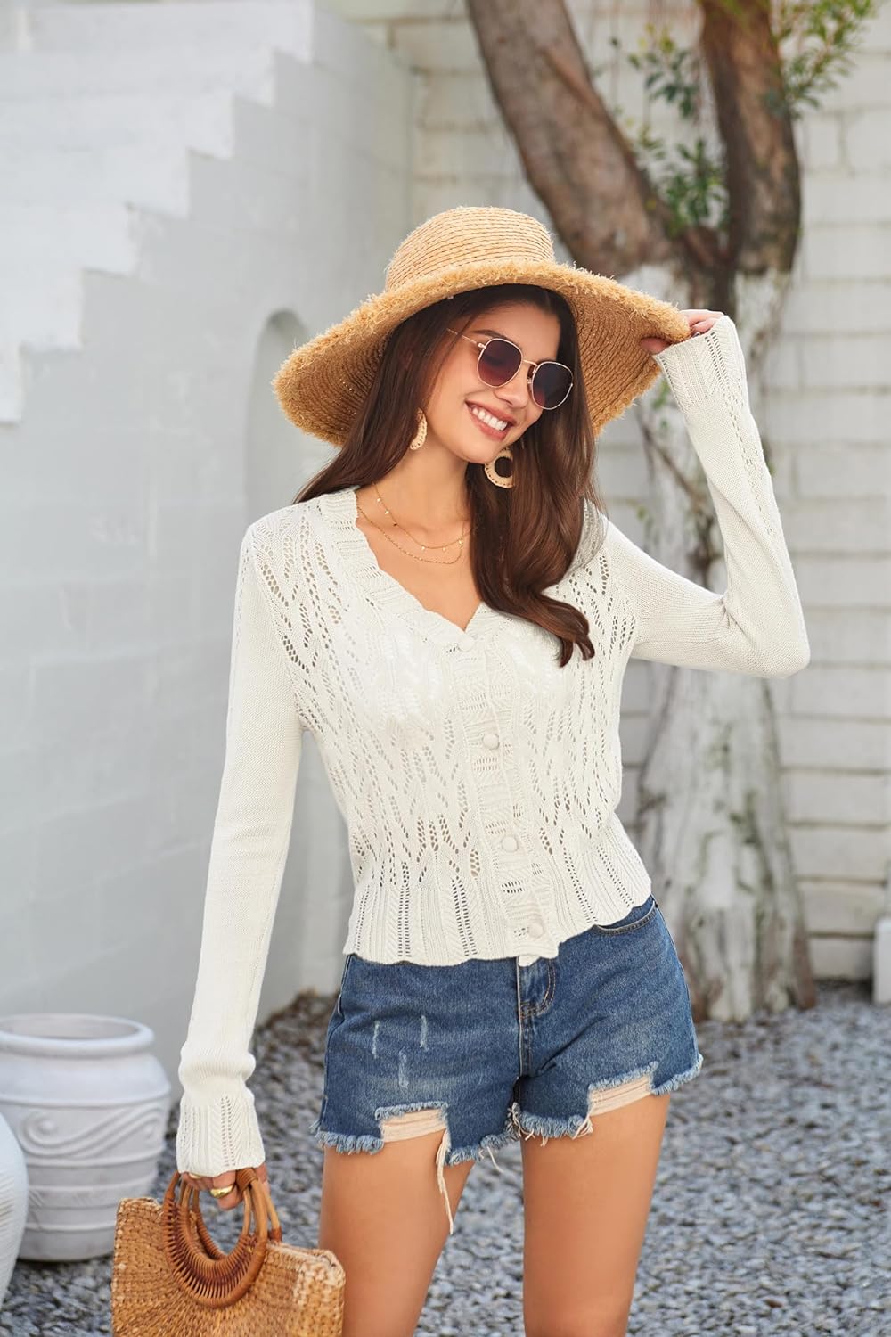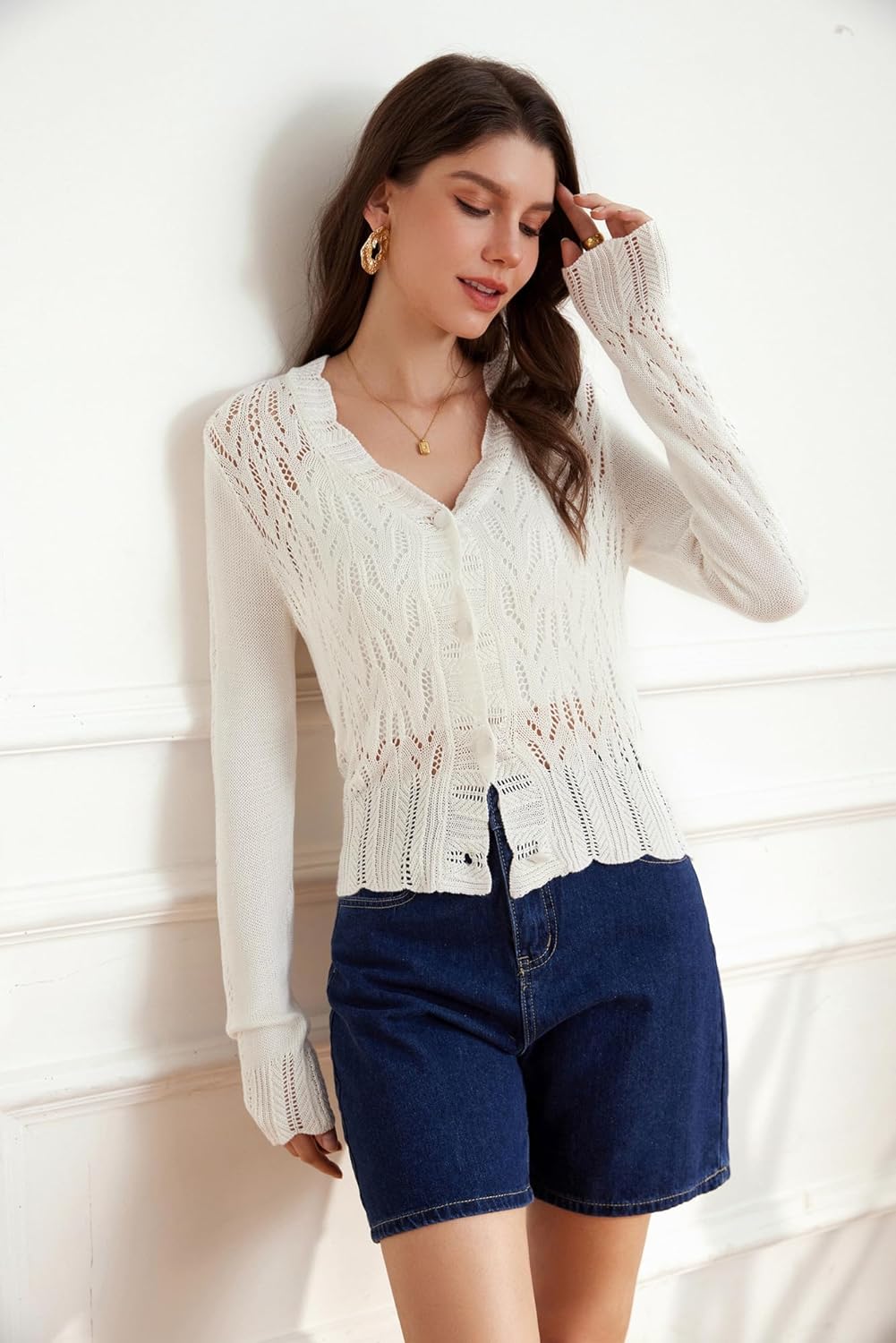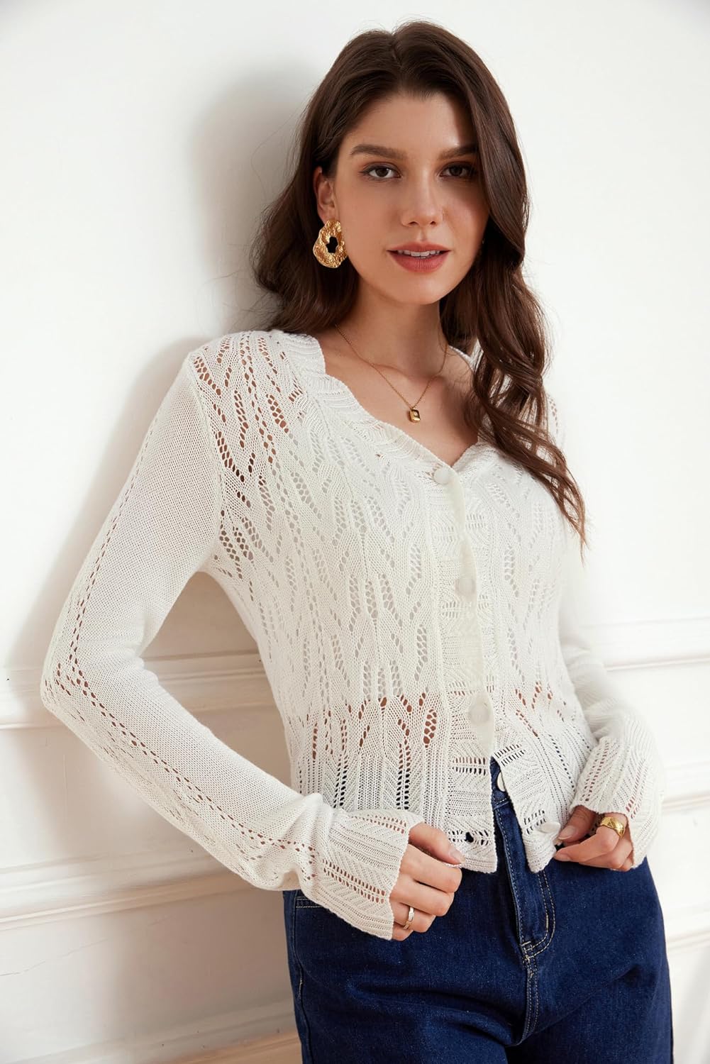 GRACE KARIN Womens Lightweight Cropped Crochet Cardigan Sweaters Summer Long Sleeve Hollow Out Knit V Neck Bolero ShrugIvory White