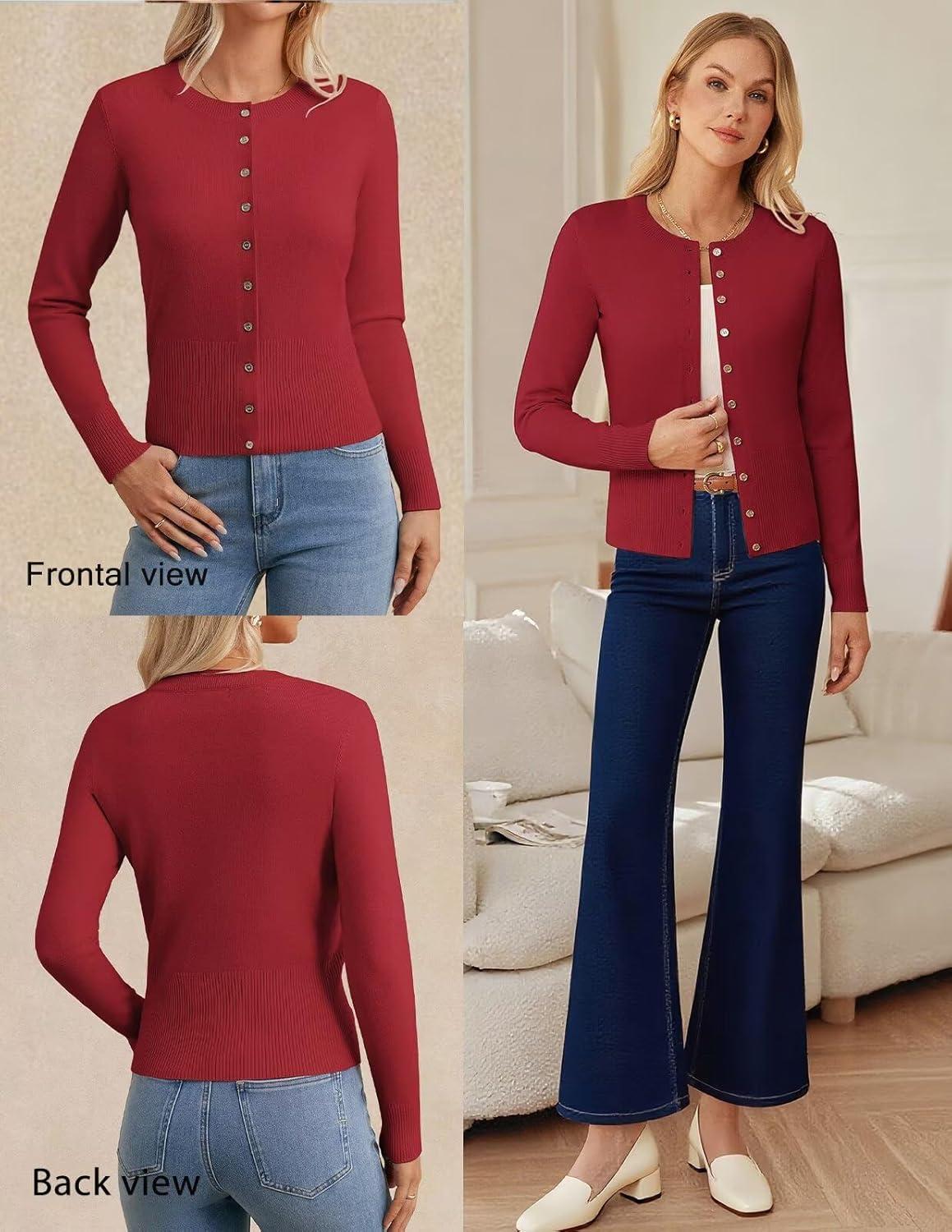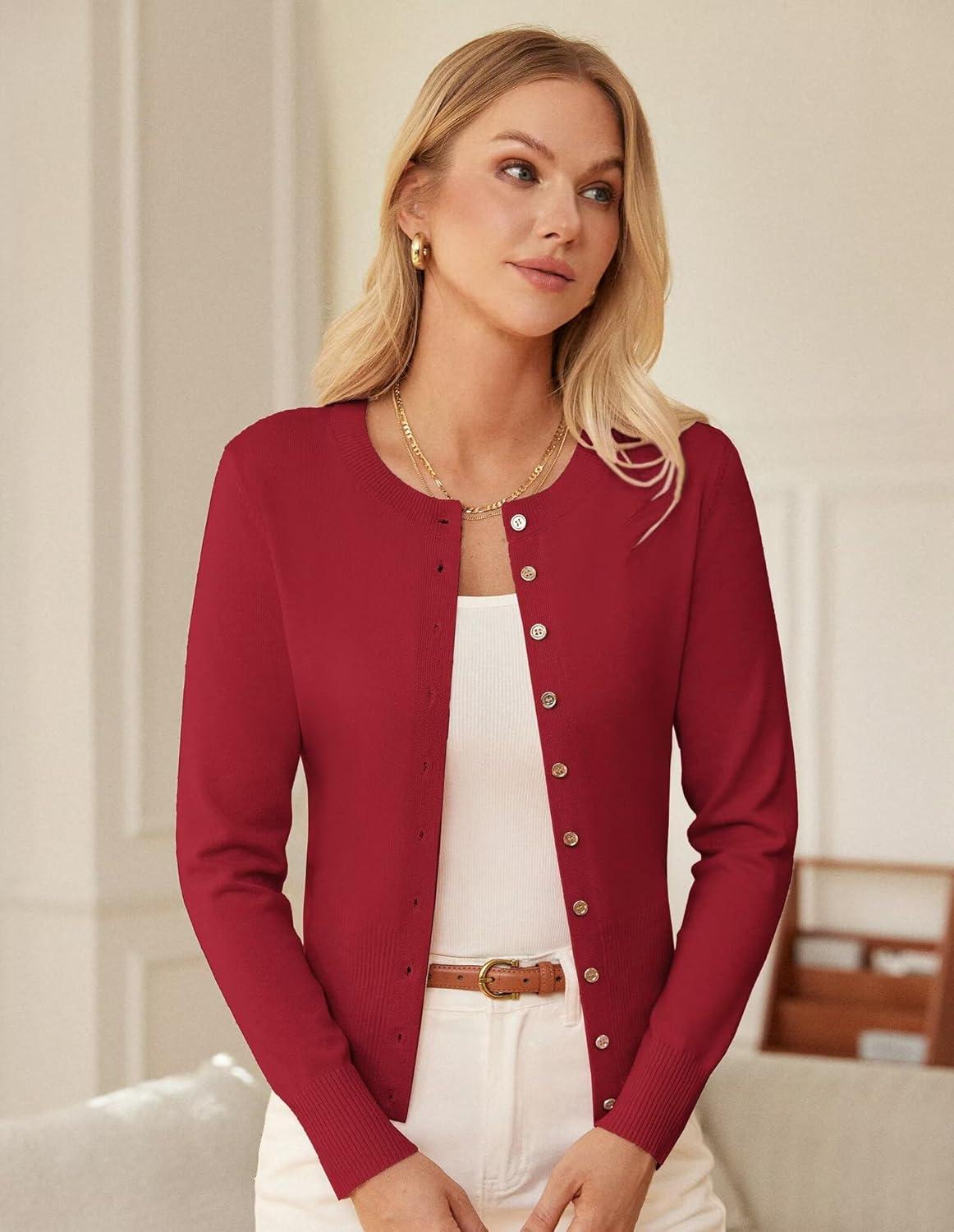 GRACE KARIN Women’s Lightweight Fall Cardigan, Long Sleeve Knit Crop Sweater Trendy, Button Open Front Crewneck Jacket(Red)