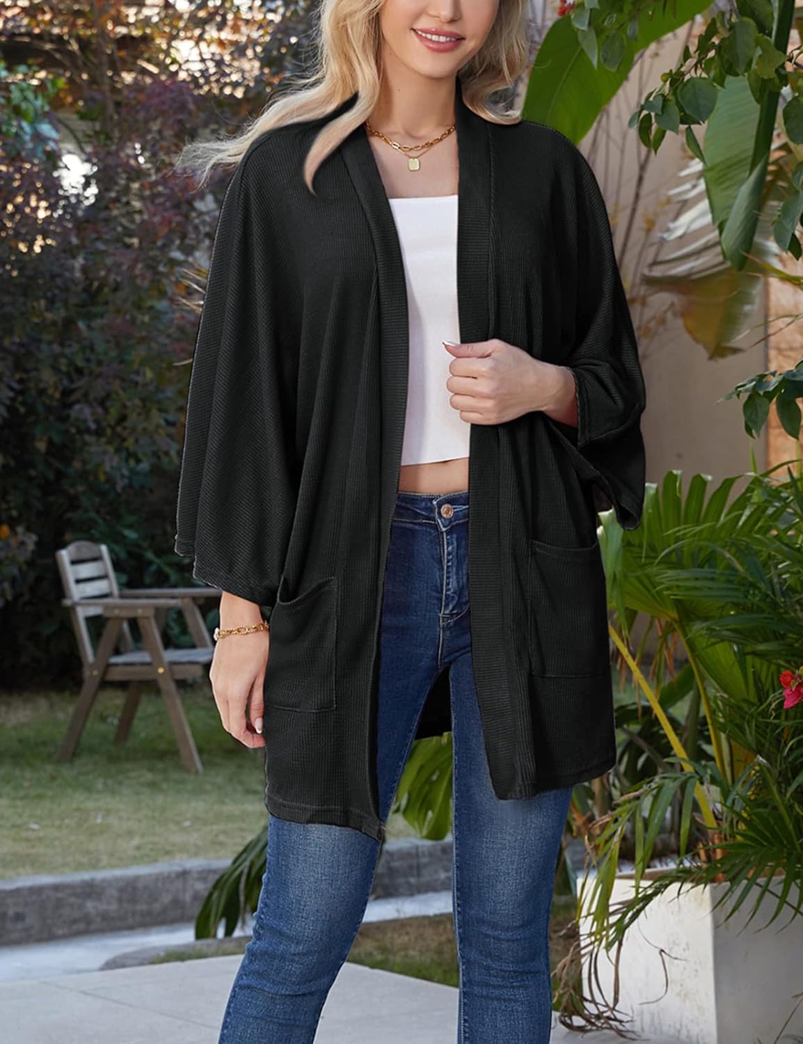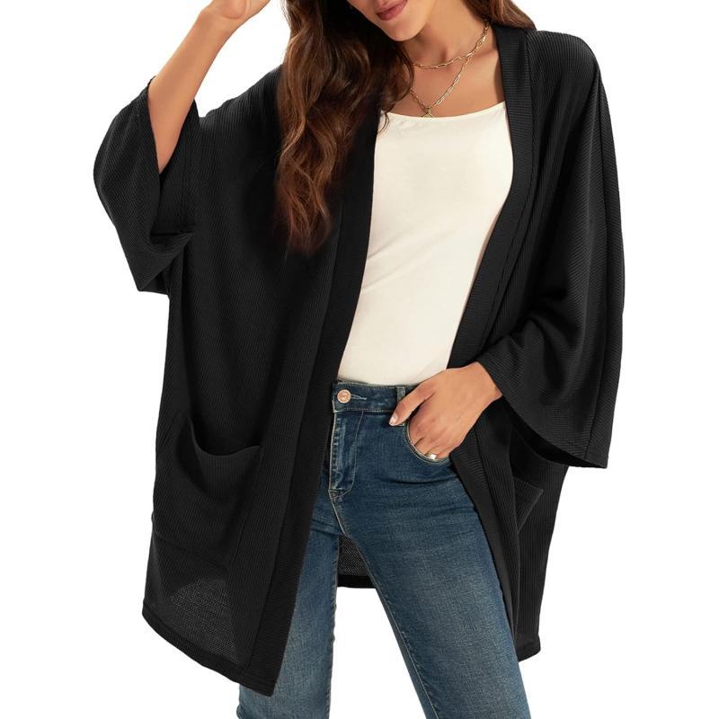GRACE KARIN Women's Lightweight Oversized Cardigan Sweater Waffle Knit Long Batwing Sleeve Kimono with Pockets(Black)