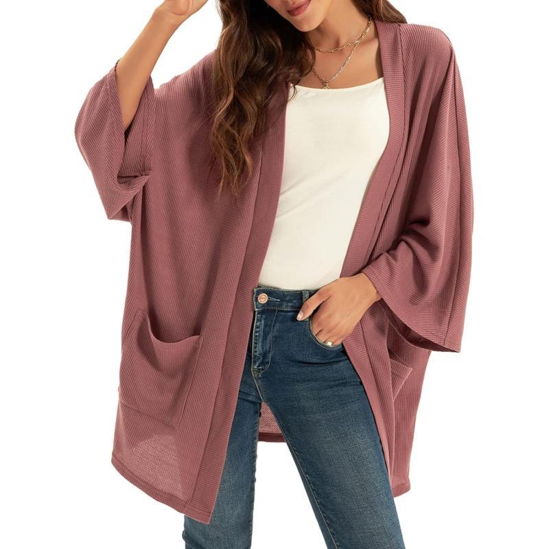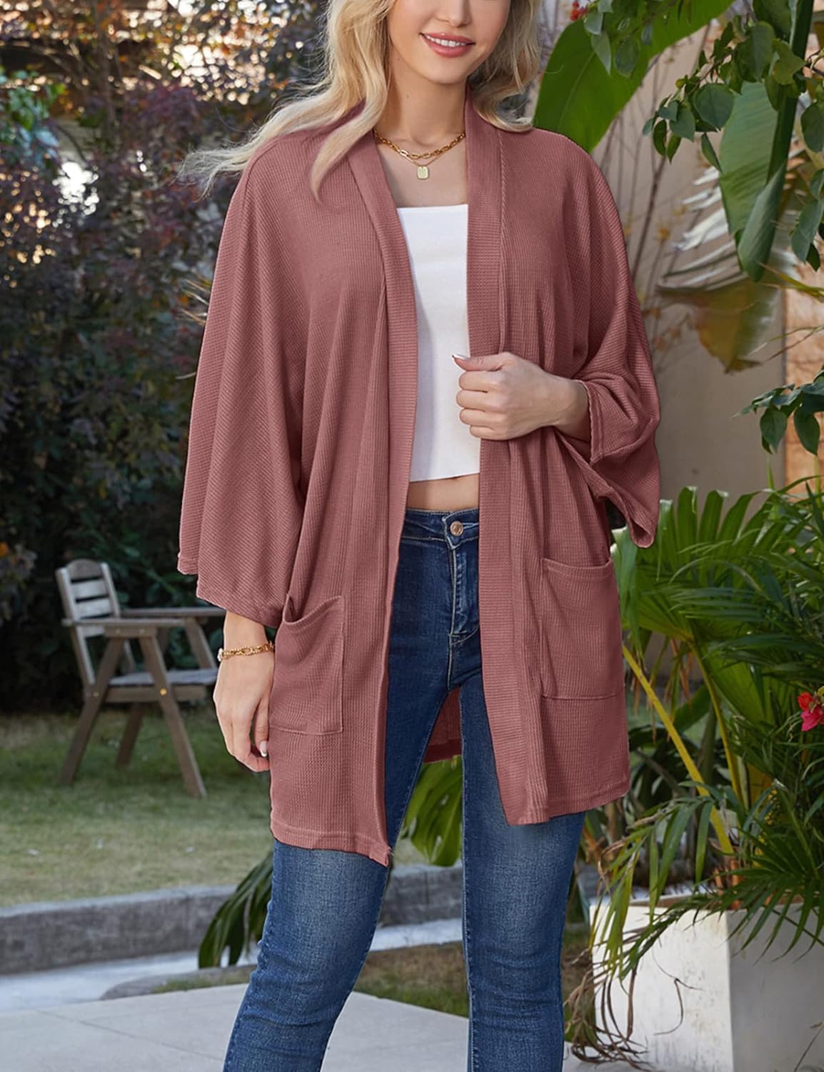 GRACE KARIN Womens Lightweight Oversized Cardigan Sweater Waffle Knit Long Batwing Sleeve Kimono with PocketsMauve Red