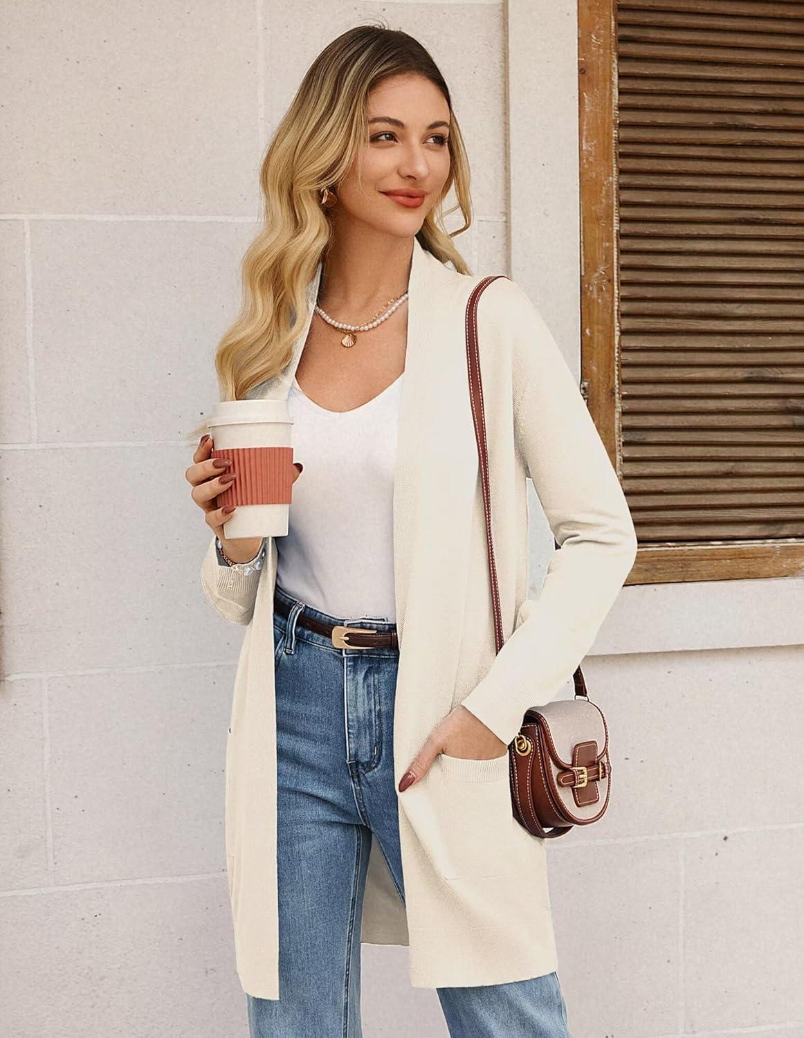 GRACE KARIN Women's Long Cardigan Sweater Open Front Classic Knitted Lightweight Sweater Coat with Pockets(Beige)