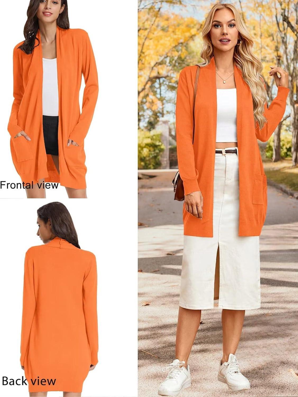 GRACE KARIN Women's Long Cardigan Sweater Open Front Classic Knitted Lightweight Sweater Coat with Pockets(Orange)