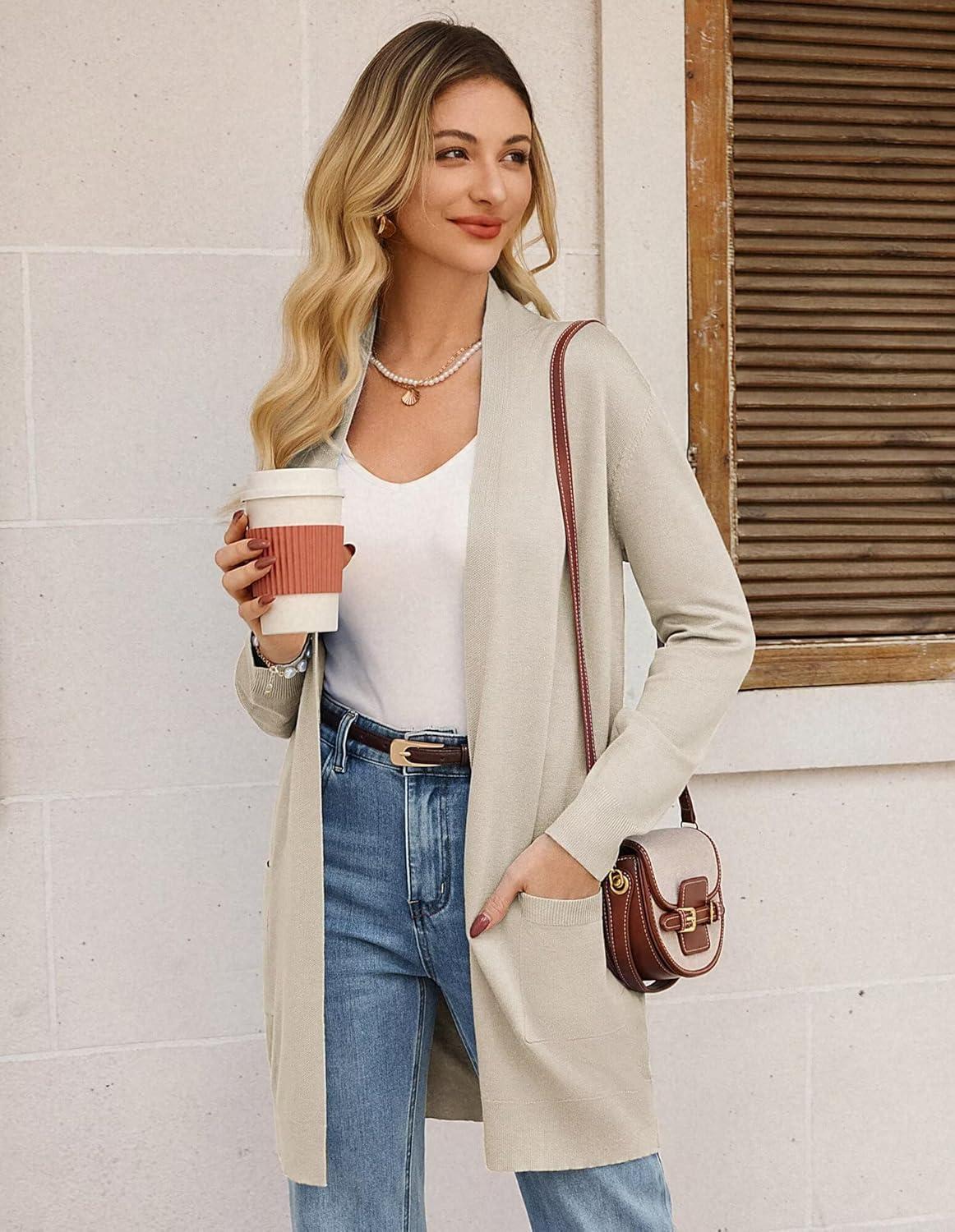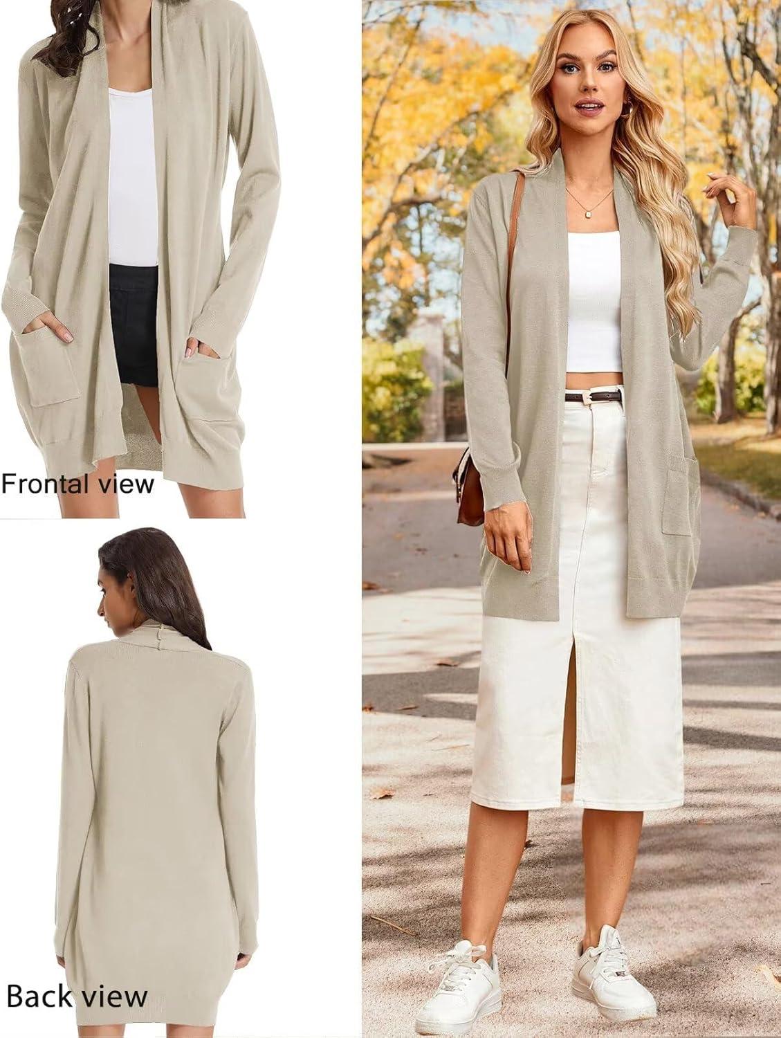 GRACE KARIN Women’s Long Cardigan Sweater Open Front Classic Knitted Lightweight Sweater with Pockets(A Tan)