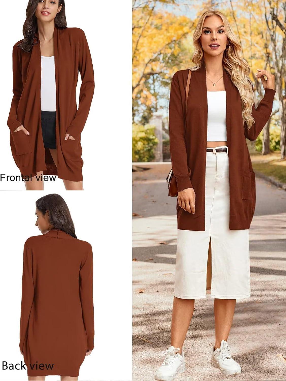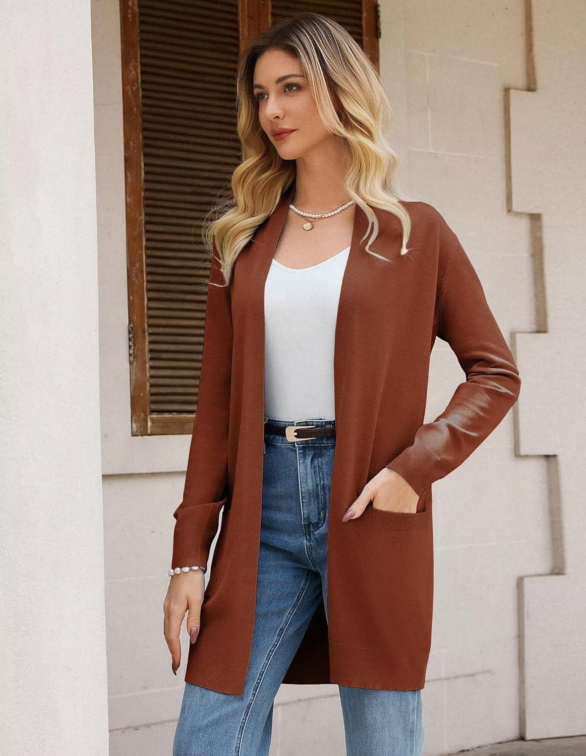 GRACE KARIN Women's Long Cardigan Sweater Open Front Classic Knitted Lightweight Sweater with Pockets(Caramel)