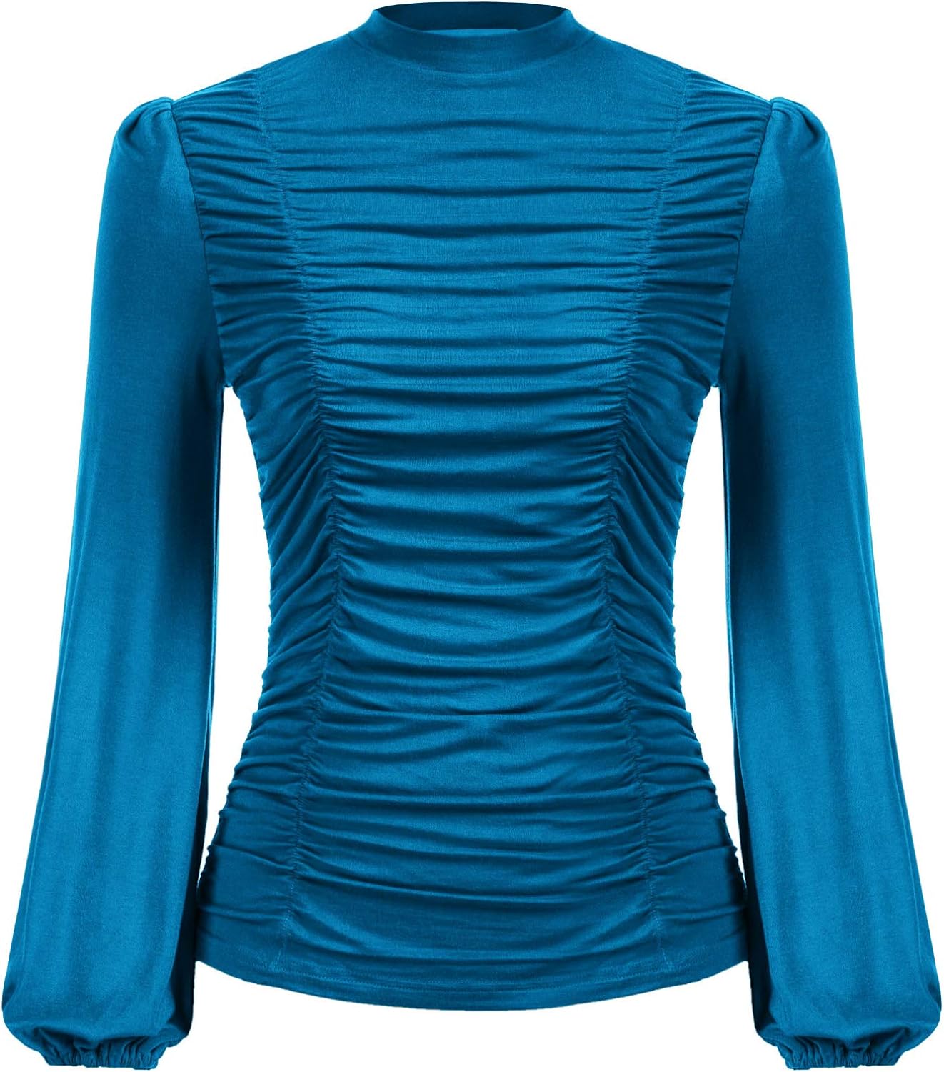 GRACE KARIN Womens Long Lantern Sleeve High-Neck Ruched Front Fitted Blouse(Peacock Blue)